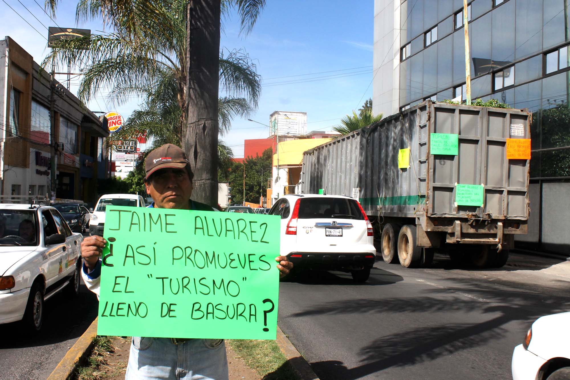 Con pancartas que decían: “Jaime Álvarez ¿así promueves el turismo lleno de basura?, Topiltzin y Jaime Álvarez quieren a Cuernavaca lleno de basura”, los trabajadores de la empresa recolectora de residuos sólidos en Cuernavaca, se plantaron con sus camiones afuera de la Secretaria de la Comisión del Agua en Avenida Plan de Ayala y de manera simultánea en la secretaría de Desarrollo Sustentable en la calle Humboldt, así como en el Miraval, luego de que el miércoles por la tarde se les impidió el paso al relleno sanitario en Cuautla.