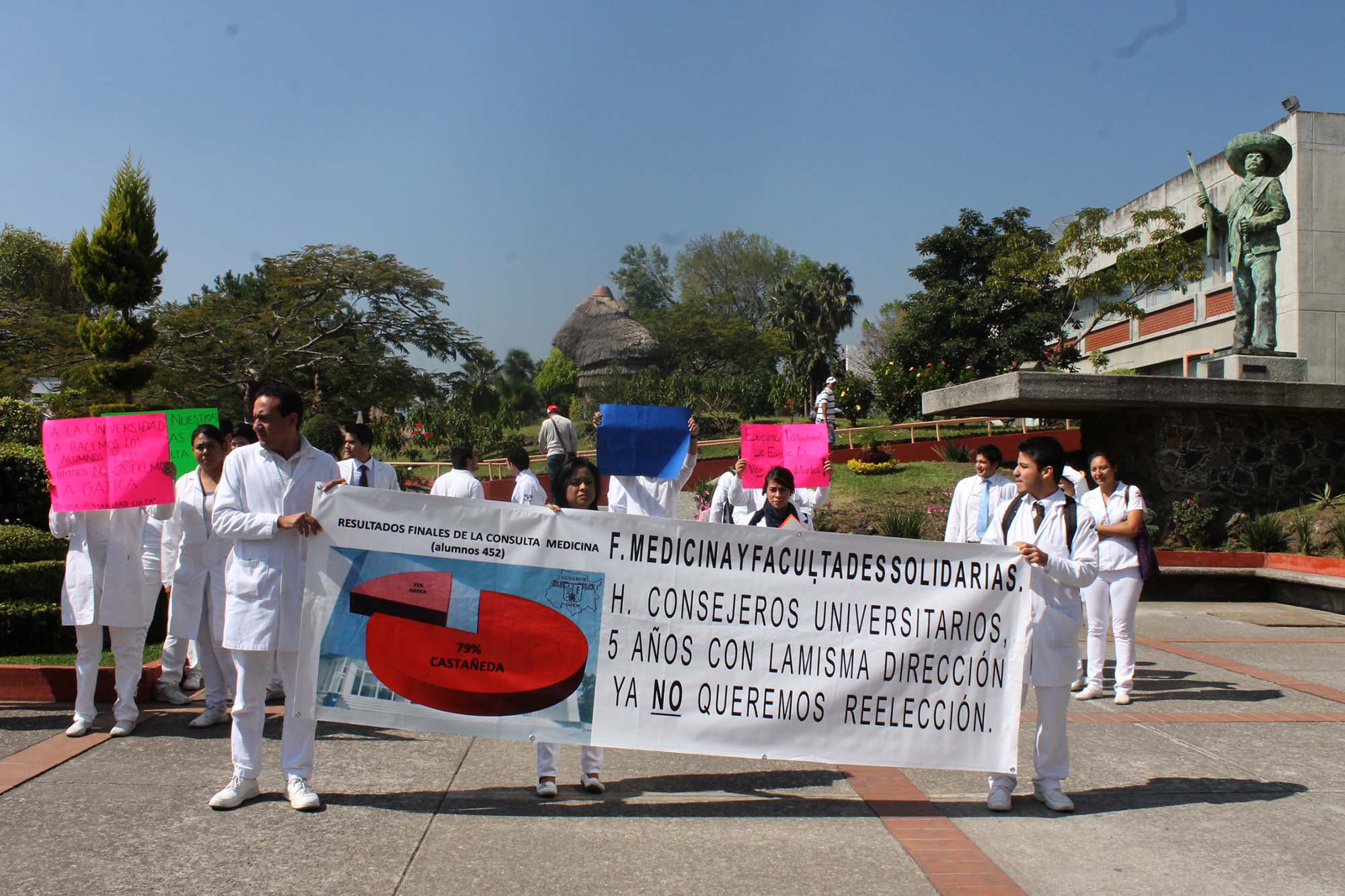 Cuernavaca, Morelos; 6 de diciembre de 2013. Cerca de 50 alumnos de la Facultad de Medicina de la Universidad Autónoma del Estado de Morelos realizaron una manifestación pacífica frente al Auditorio Emiliano Zapata contra la reelección del actual director de esa facultad.