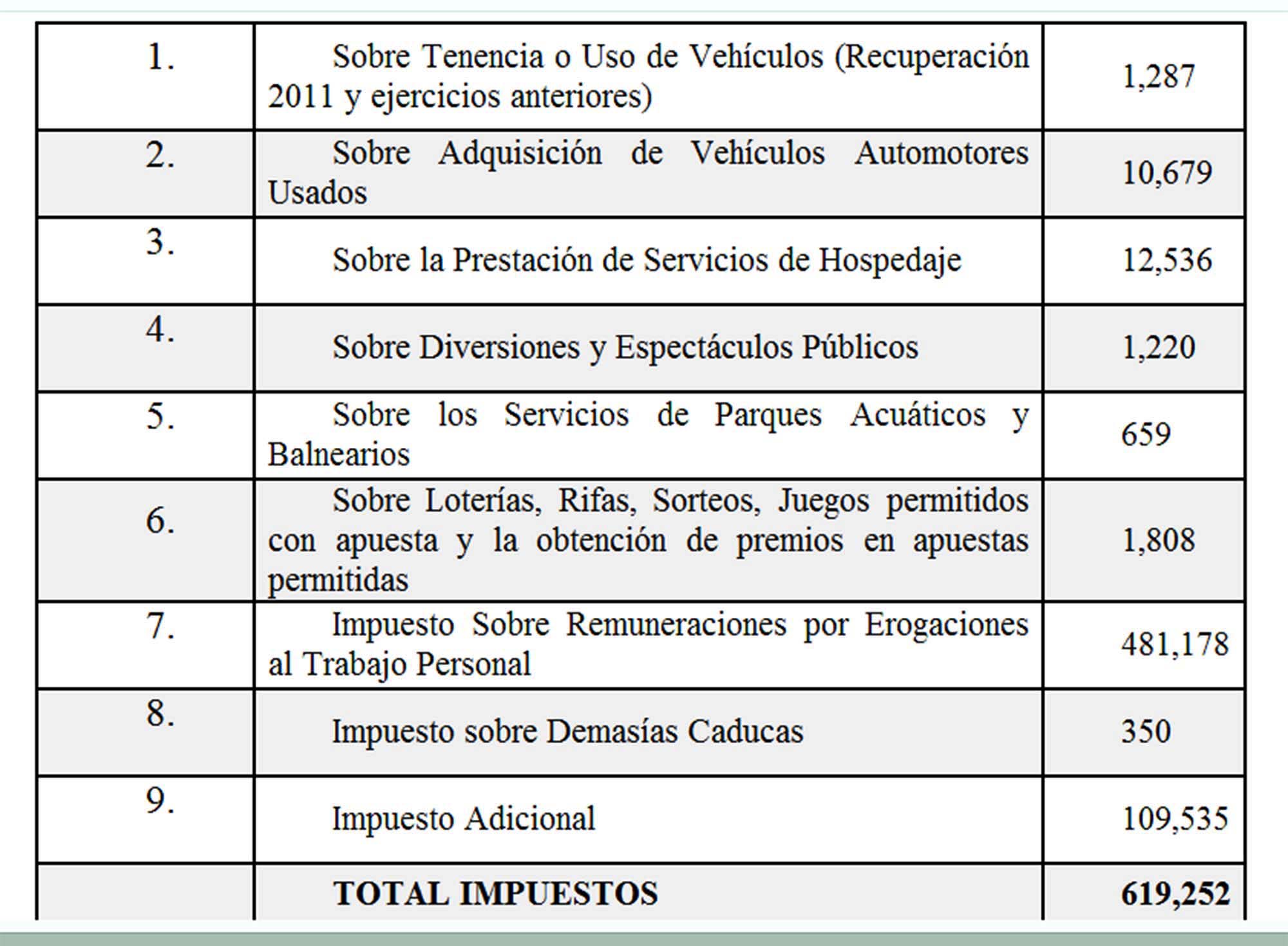 Por otra parte, en materia de ingresos propios correspondiente a la recaudación por impuestos la Ley de Ingresos considera, entre otros servicios, los siguientes conceptos: