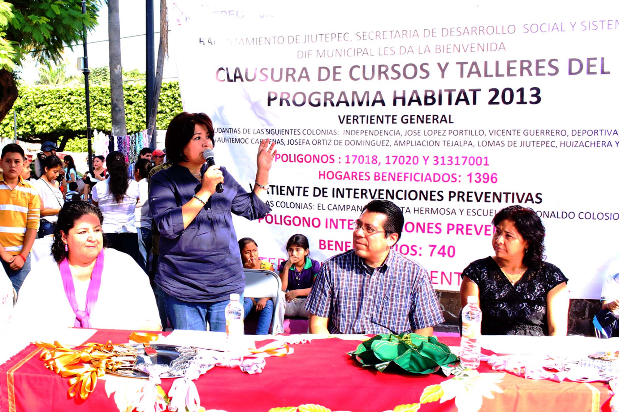 Jiupepec, Morelos; 19 de diciembre de 2013. Con la firme convicción de reconstruir el tejido social de Jiutepec, la Presidenta Municipal Silvia Salazar Hernández acompañada de Jesús Clavijo Vázquez representante de la Secretaría de Desarrollo Agrario, Territorial y Urbano (SEDATU) y la Presidenta del Sistema para el Desarrollo de la Familia (DIF) Jiutepec Yolanda Salazar Hernández clausuró los talleres y cursos del programa HÁBITAT 2013 que se implementaron en 13 Colonias.