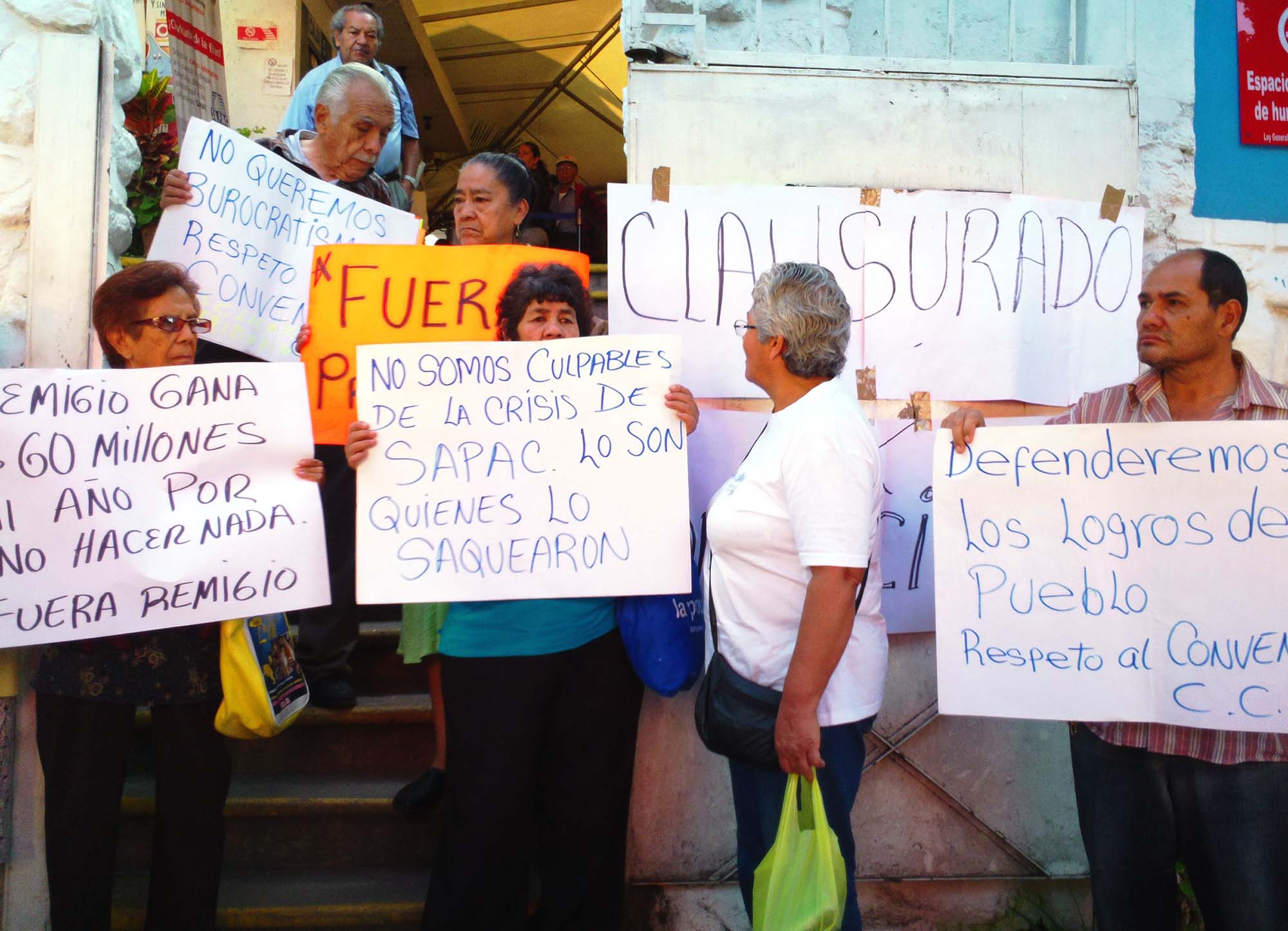 Cuernavaca, Morelos; 1 de octubre de 2013. Integrante del Comité de Colonias en Lucha, en su mayoría adultos mayores con cartulina en mano y consignas, clausuraron por algunos minutos la entrada a las oficinas centrales del Sistema de Agua Potable y Alcantarillado de Cuernavaca, SAPAC, por lo que aquellos usuarios que querían acceder a las cajas a realizar el pago por la prestación del servicio se vieron imposibilitados a hacerlo, incluso hubo quienes se enfrascaron en alguna discusión con los manifestantes.