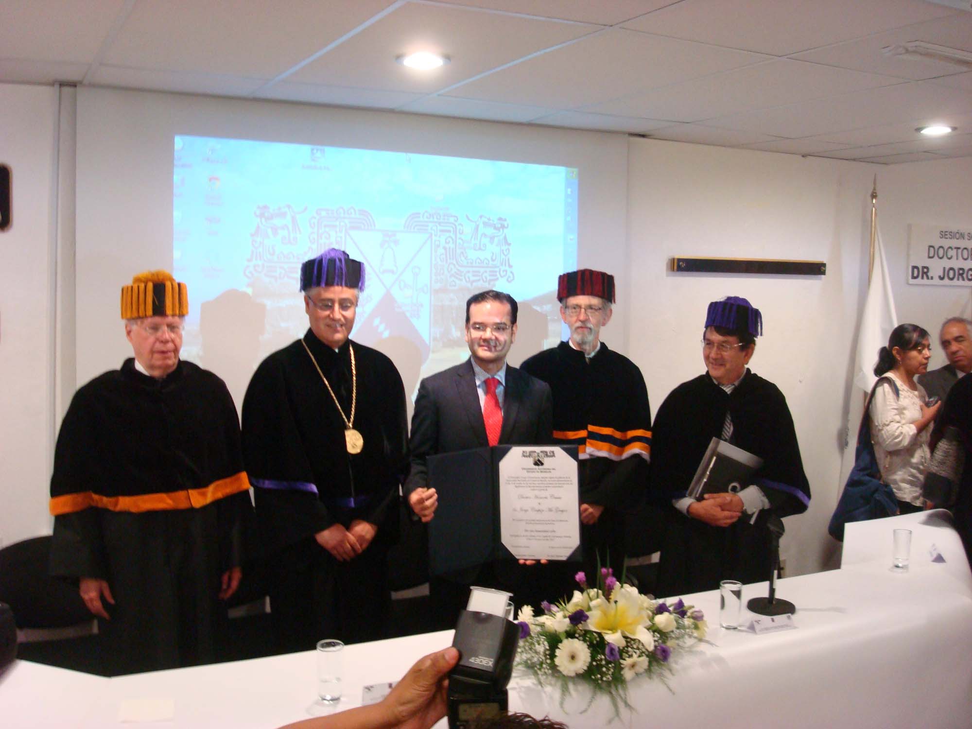 Cuernavaca, Morelos; a 27 de junio de 2013. En el marco de las actividades por los 60 años de la Universidad Autónoma del Estado de Morelos (UAEM) el rector Jesús Alejandro Vera Jiménez, encabezó la ceremonia solemne de entrega a la familia del Dr. Jorge Carpizo Mac. Gregor del Doctorado Honoris Causa.