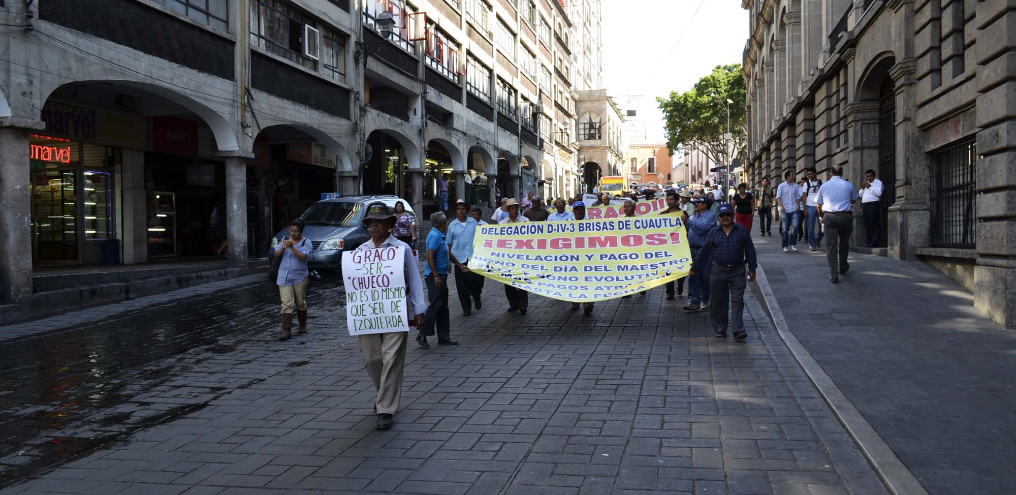 Con pancartas y consignas como “Graco, traidor, traicionas al profesor” y “Graco, malvado, traicionas al jubilado”, los profesores caminaron por el centro de la ciudad y exigieron al mandatario estatal el pago de estas prestaciones, ya que en días anteriores Graco Ramírez había afirmado que esos bonos se suspenderían porque eran ilegales.