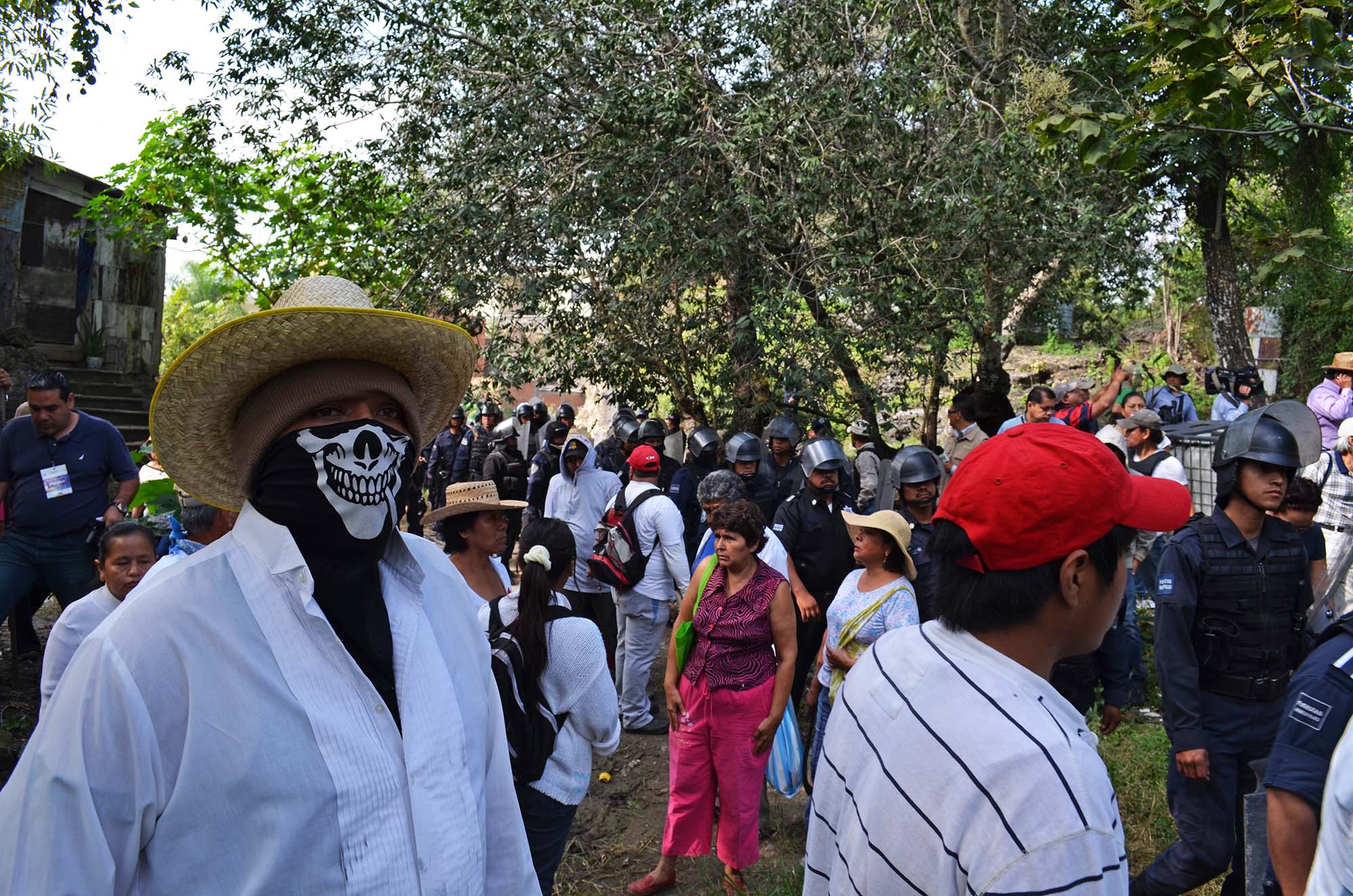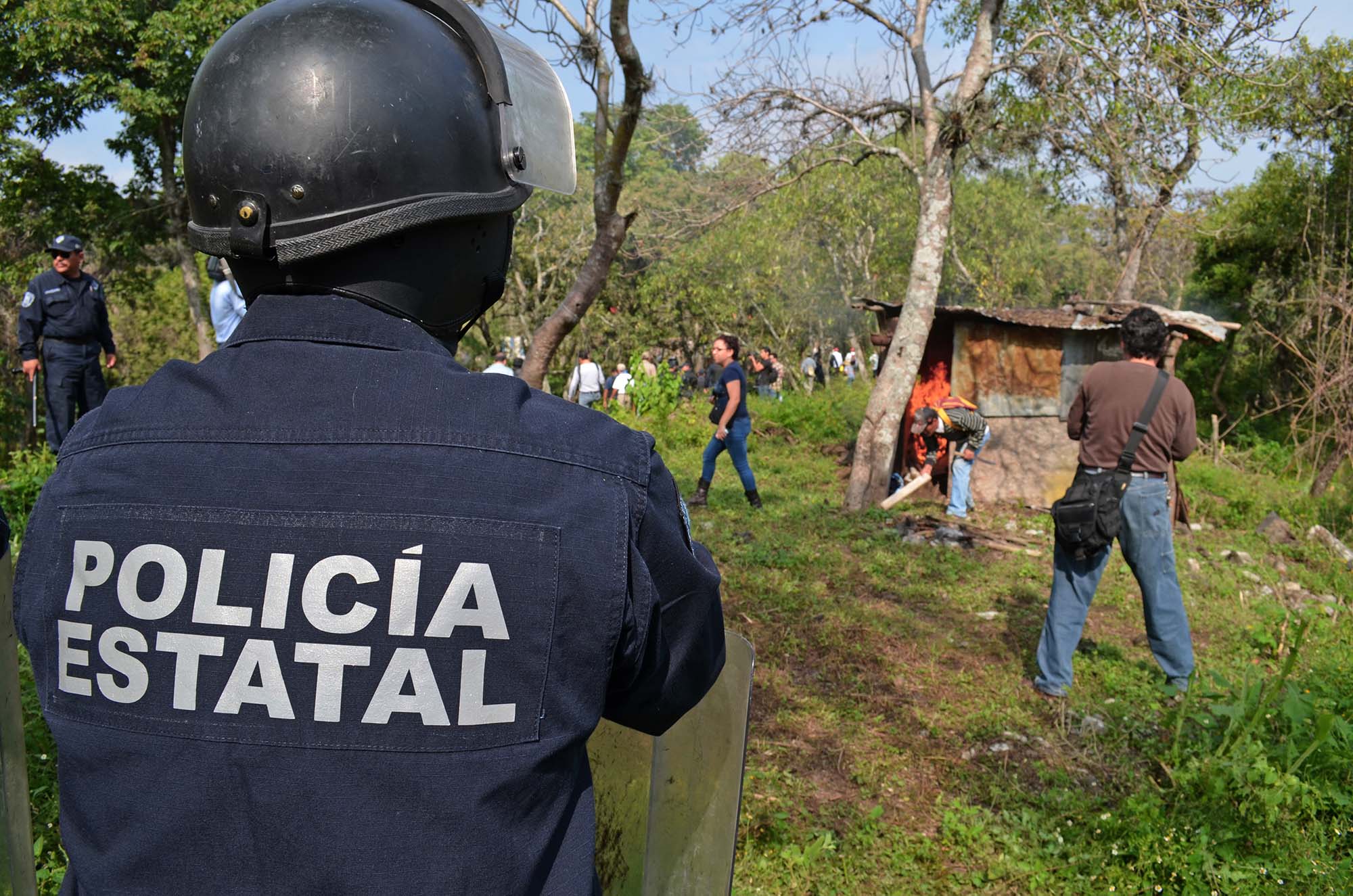 A las 10:30, más de 600 policías de la Secretaría de Seguridad Pública del Estado (SSP) y cerca de 50 personas que se dijeron ser comuneros, muchos de ellos jóvenes con el rostro cubierto con paliacates y trapos, comenzaron a echar gasolina y a prender fuego a las viviendas, la mayoría de ellas, hechas de tablas y lonas, en El Texcal, quemando ropa, camas y trastos.