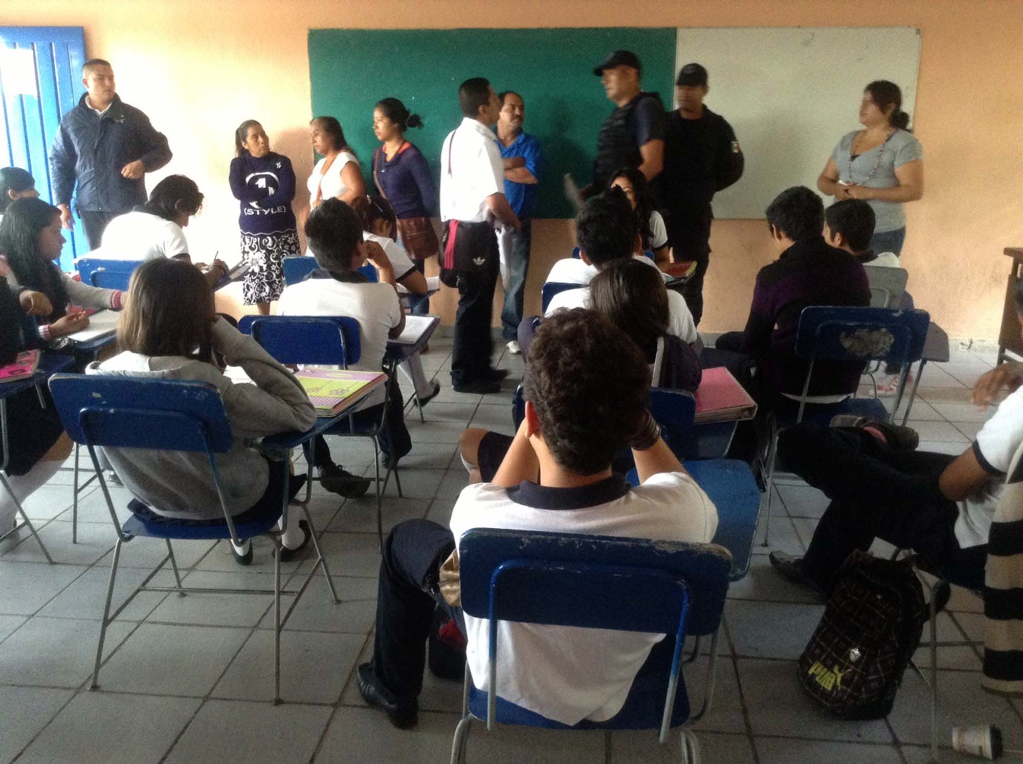 Emiliano Zapata, Morelos; 31 de octubre de 2013. Efectivos policiacos de la Secretaría de Seguridad Pública de Emiliano Zapata e integrantes del Departamento del Prevención del Delito llevaron a cabo el Operativo Mochila en la preparatoria Valentín Gómez Farías.