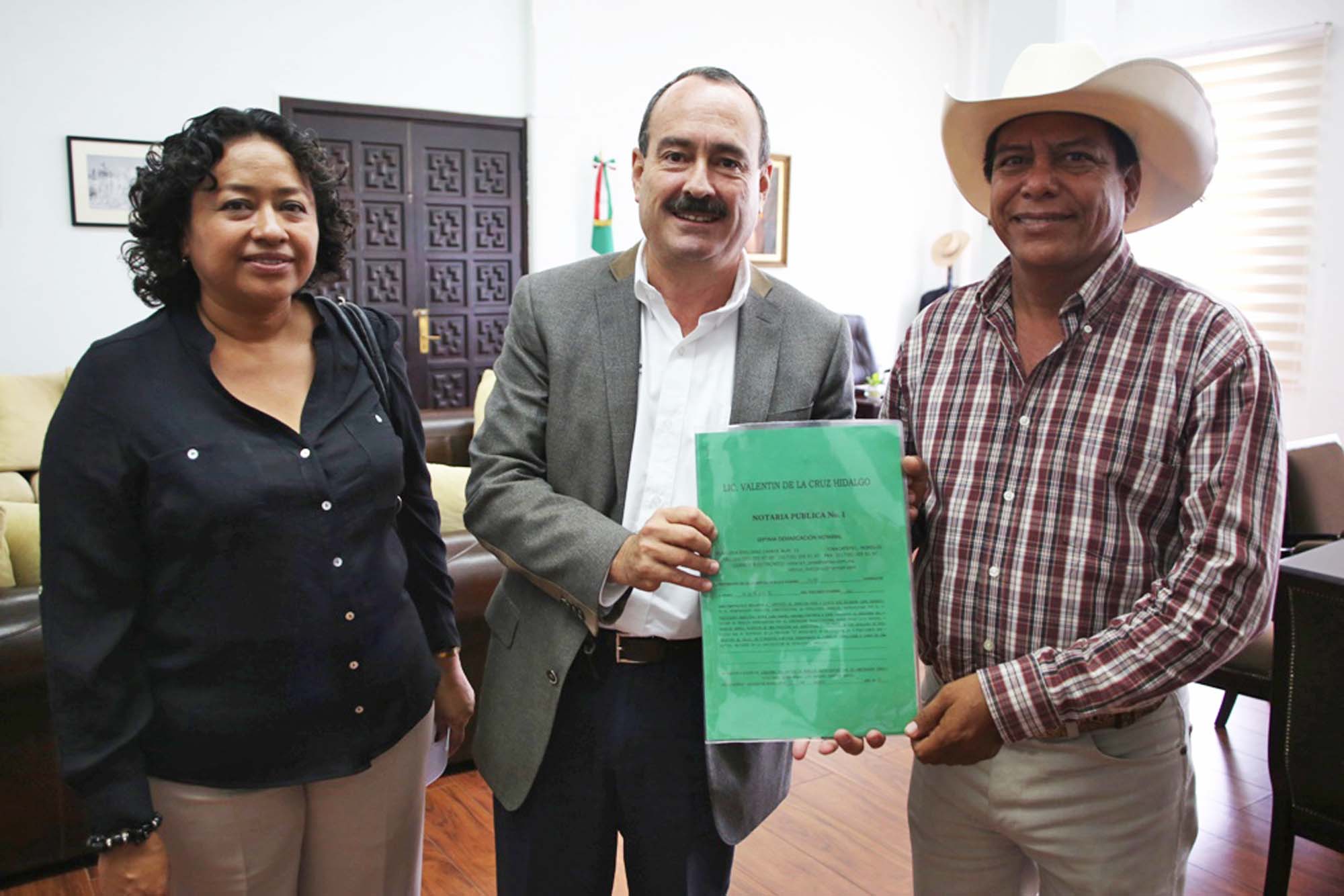 Cuernavaca, Morelos; 23 de agosto de 2013. El secretario de Gobierno, Jorge Messeguer Guillén recibió en Casa Morelos al presidente municipal de Tepalcingo, Juan Manuel Sánchez Espinoza y a la síndico municipal, Maribel Juárez Torres, quienes le entregaron las escrituras del predio que donaron en representación del Ayuntamiento al Gobierno del Estado, para la construcción del cuartel para la Policía de Mando Único para la zona sur-oriente del estado.