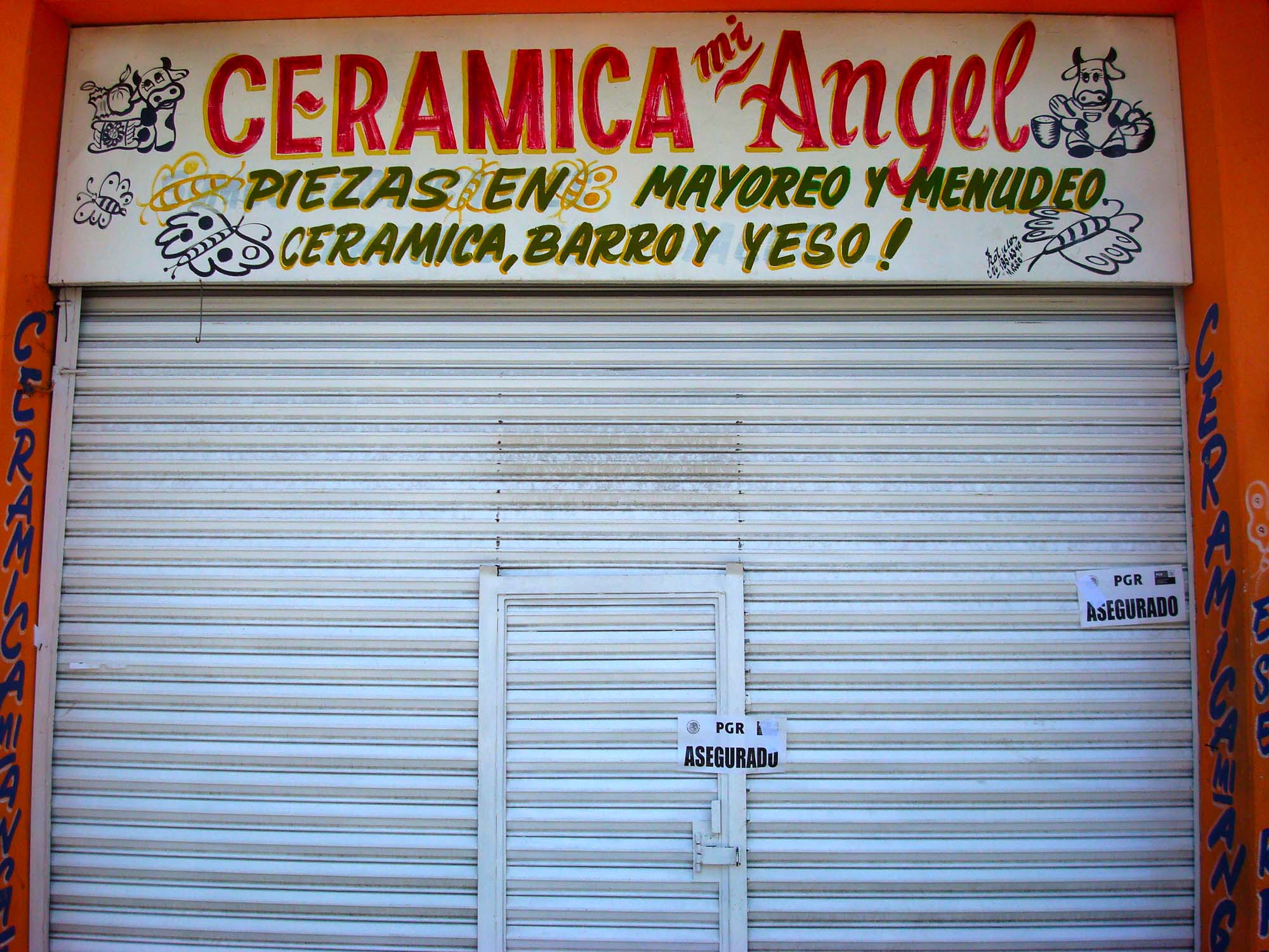 Emiliano Zapata, Morelos; 13 de junio de 2013. La señora Karla Salgado, vendedora de cerámica en la colonia Tres de Mayo, en el municipio de Emiliano Zapata, dio a conocer que los anuncios de “Asegurado” que pusieron los representantes de la Procuraduría General de la República (PGR), al clausurar los negocios que vendían figurillas de “Hombre Araña” les ha afectado porque la gente tiene miedo de acercarse a los otros negocios que no fueron suspendidos.