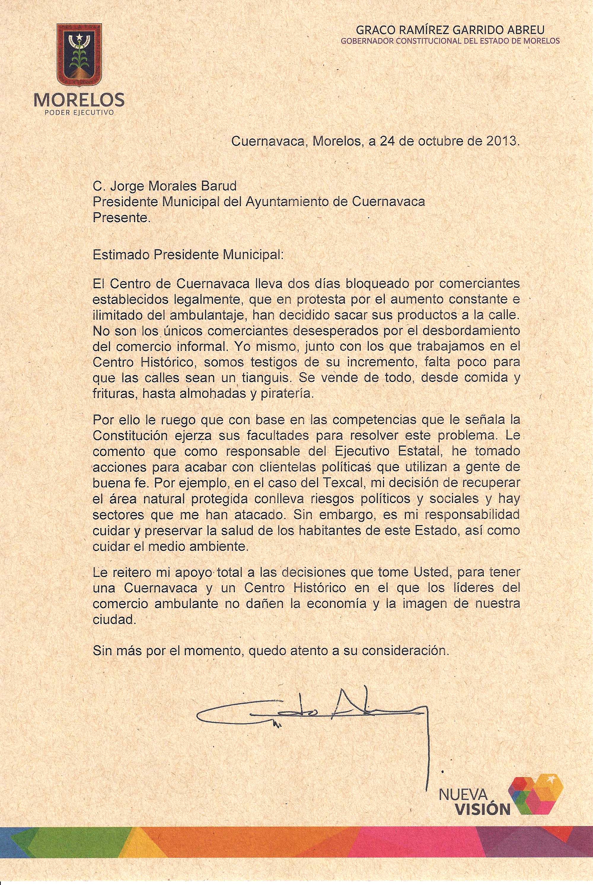 A través de una carta enviada al presidente municipal este jueves, Graco Ramírez pide que con base en las competencias que le señala la Constitución, ejerza sus facultades para resolver este problema que afecta de forma directa el proceso cotidiano de desarrollo económico, y la imagen turística de este sitio.