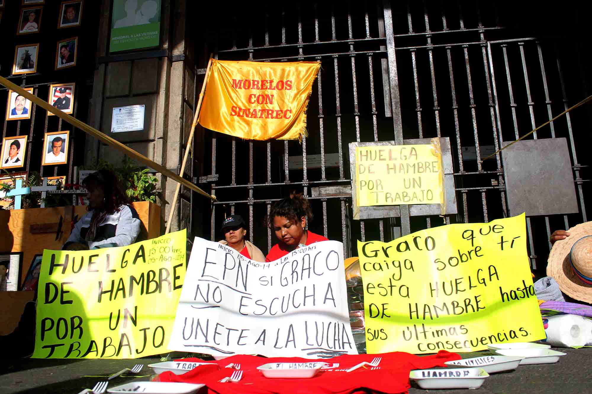Cuernavaca, Morelos; 6 de agosto de 2014. Trabajadoras sindicalizadas del Sindicato Nacional de Trabajadores, Empleados, Choferes, Transportistas y Obreros de la Construcción en General (SINATREC) que mantienen una huelga de hambre en las puertas del palacio de gobierno acusaron al secretario del Trabajo del estado de pactar con los líderes del Nuevo Grupo Sindical y de excluirlas.