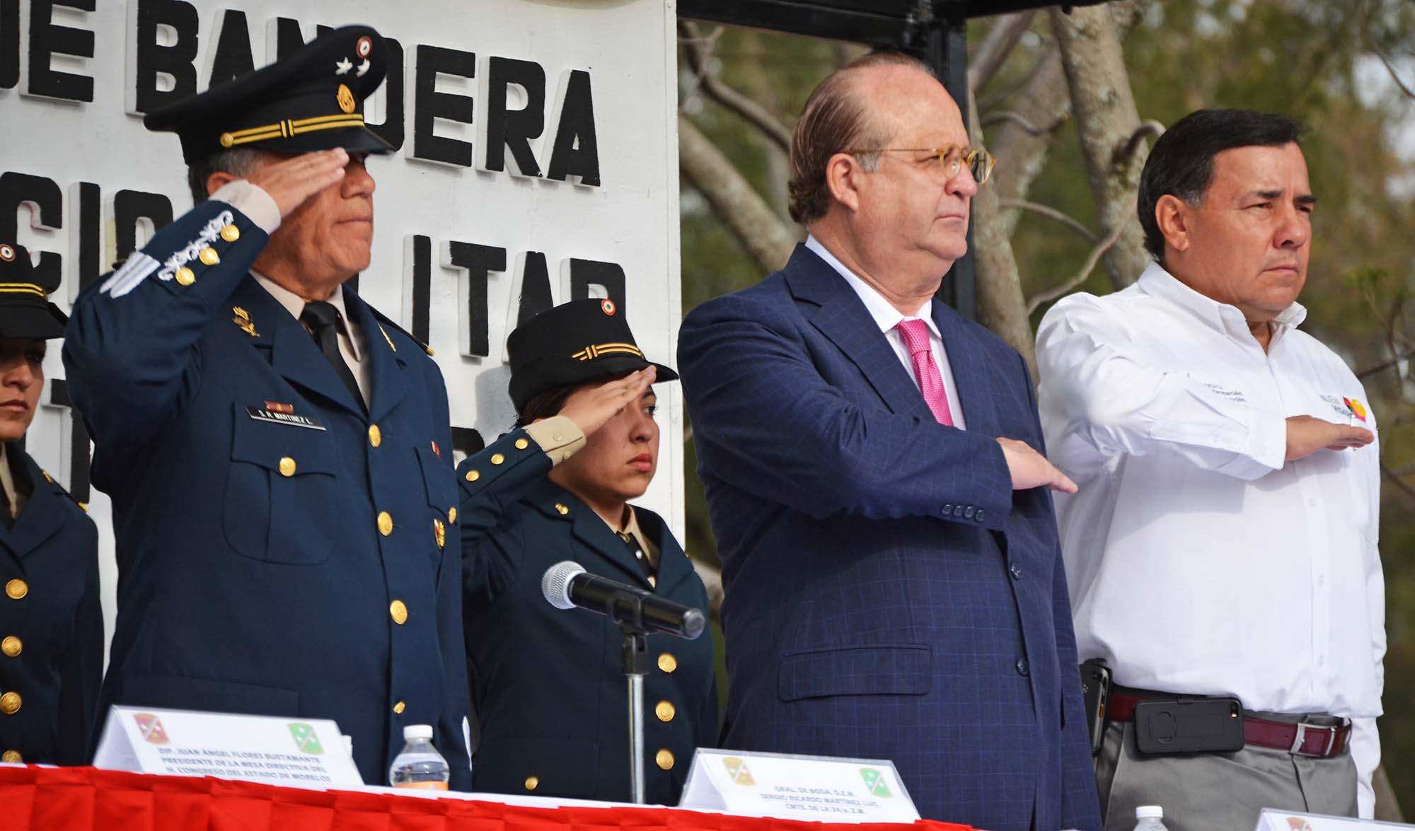 En esta ceremonia de Honores a la Bandera, Graco Ramírez estuvo acompañado por el Presidente de la Mesa Directiva del Congreso del estado, Juan Ángel Flores Bustamante, y el Comandante de la 24a Zona Militar, Sergio Martínez Luis.