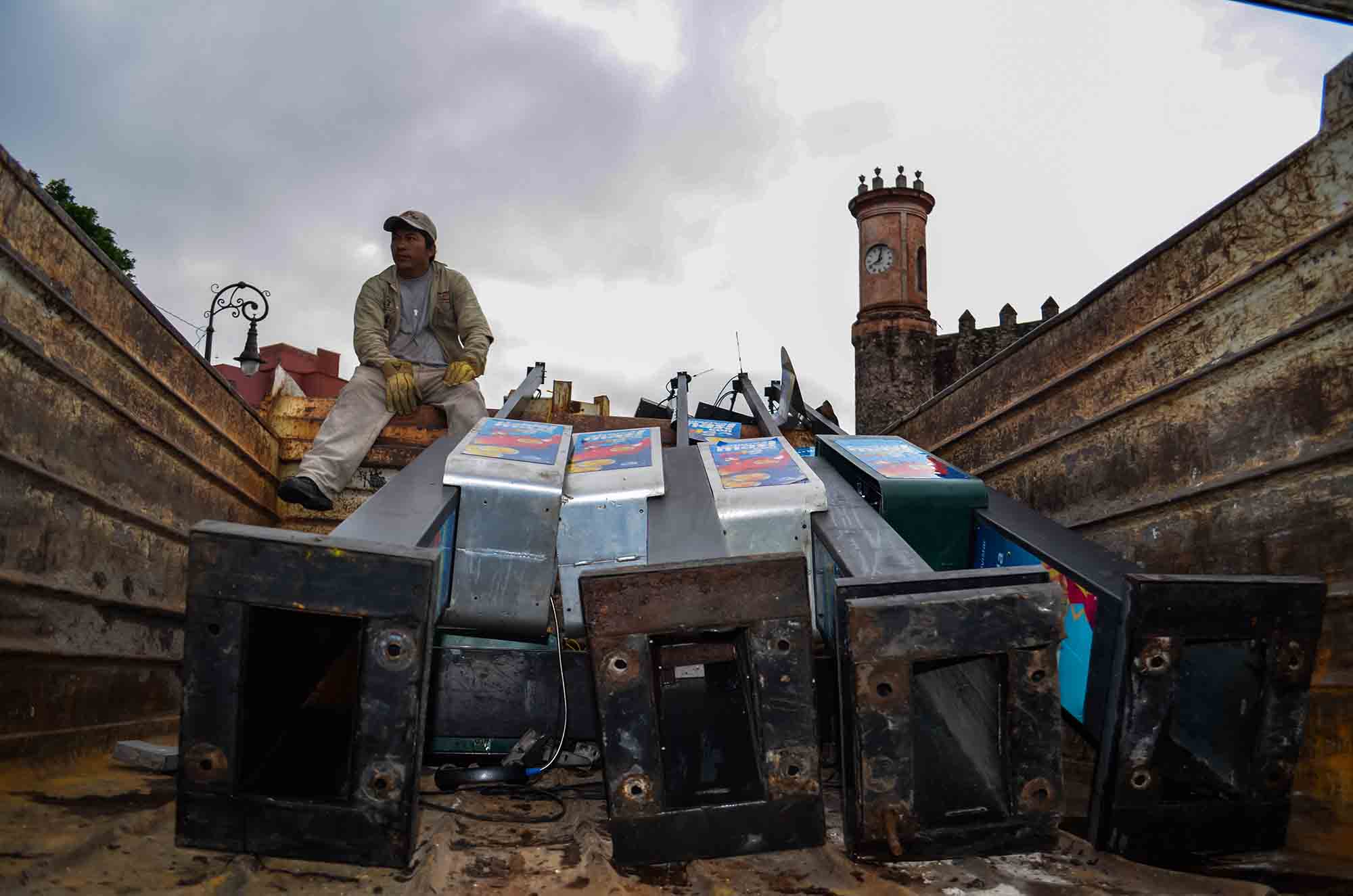 Hoy, desde las seis de la mañana, armados con barretas, pinzas, llaves y desarmadores comenzaron a desinstalar casetas telefónicas de Telmex en Plaza de Armas y en algunas calles del primer cuadro de la ciudad, para posteriormente subirlas a camiones de volteo de la comuna capitalina.