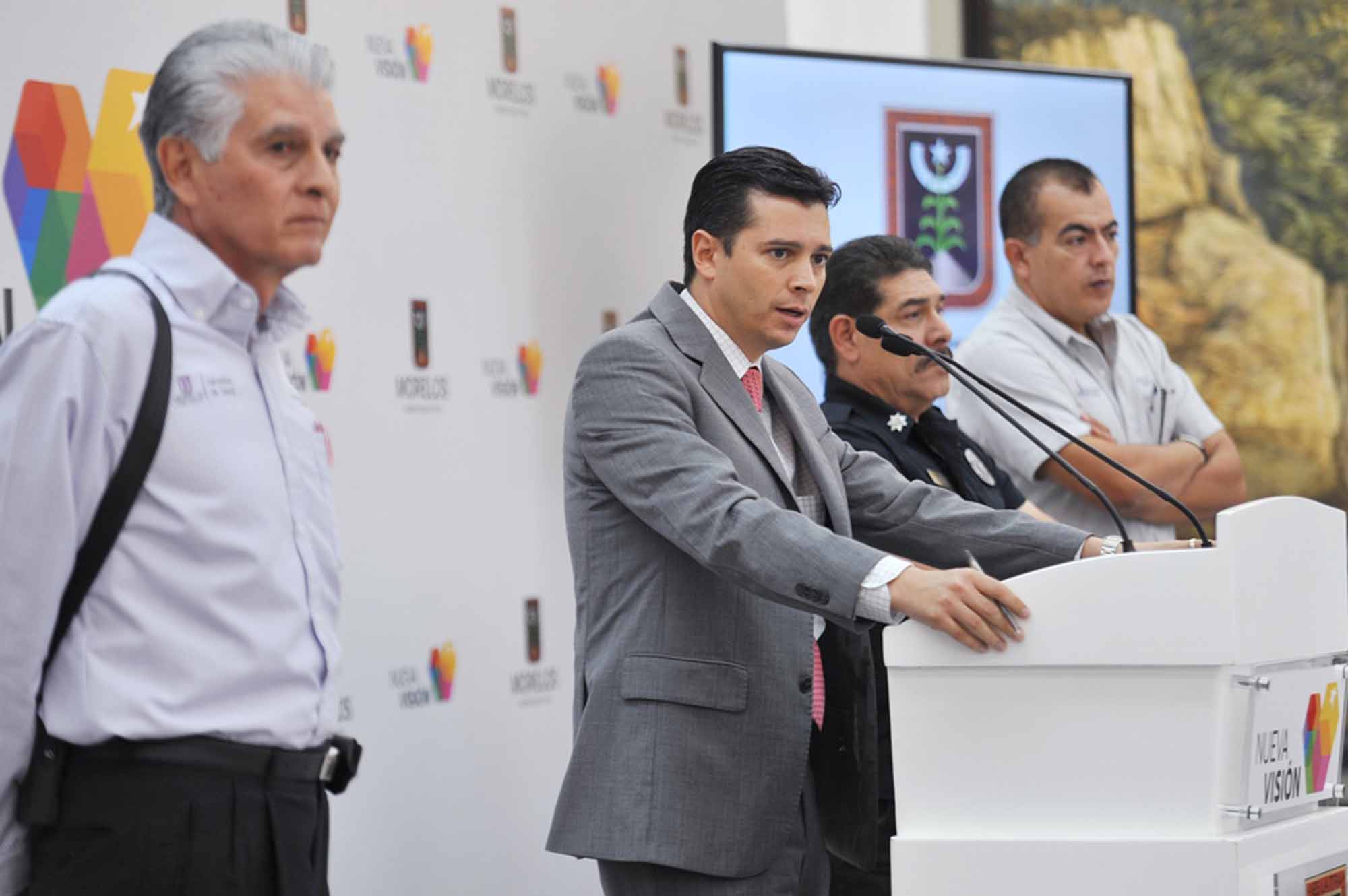 Omar Darío De Lassé fue acompañado, en la rueda de prensa sobre la movilización pacífica de las mujeres del acceso principal de Casa Morelos, por Sergio Bautista Sánchez, Fiscal Metropolitano; Alejandro Mercado Granados, coordinador estatal del CRUM y Javier Viruete Munguía, comisionado operativo del Mando Único.