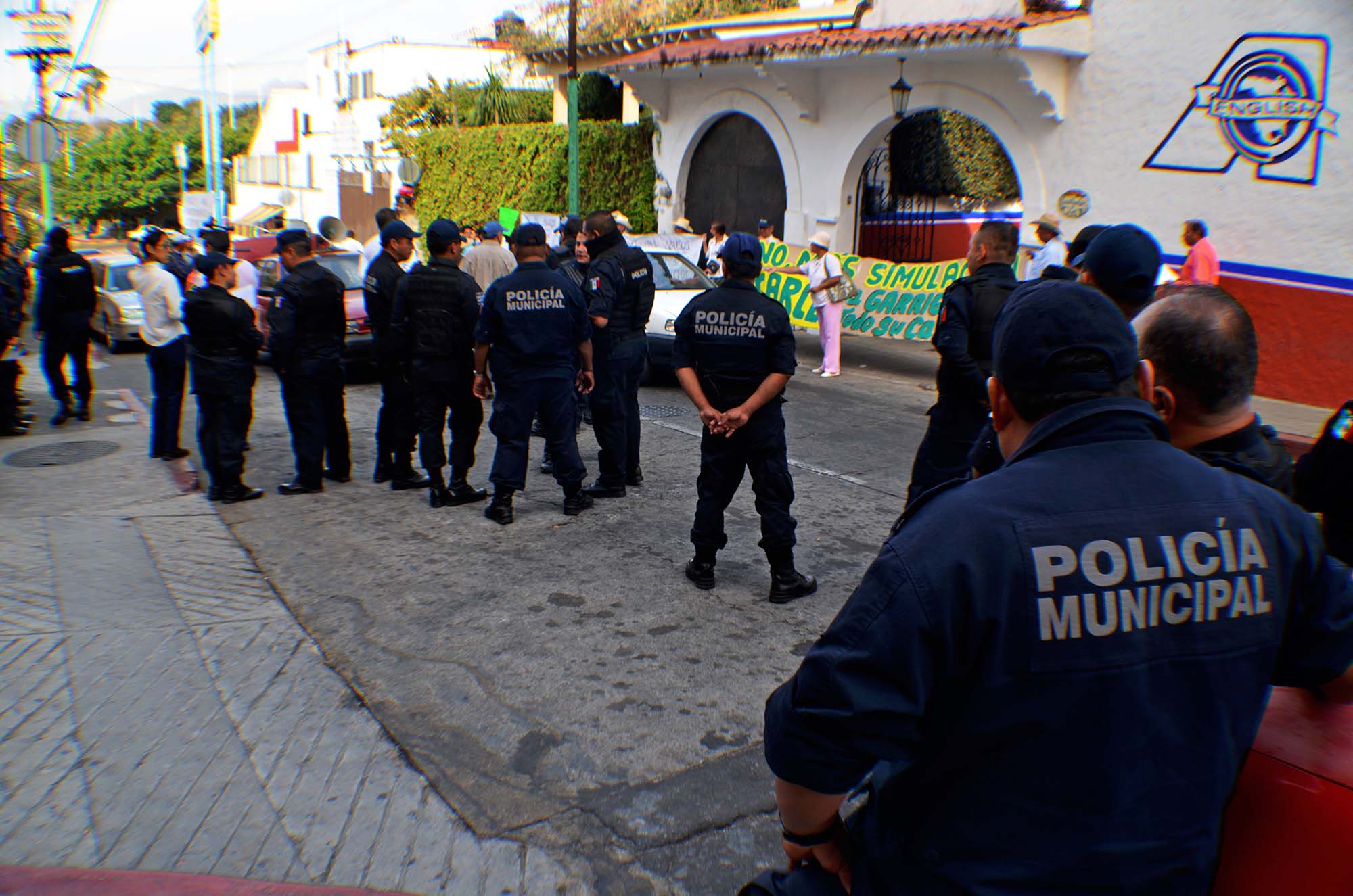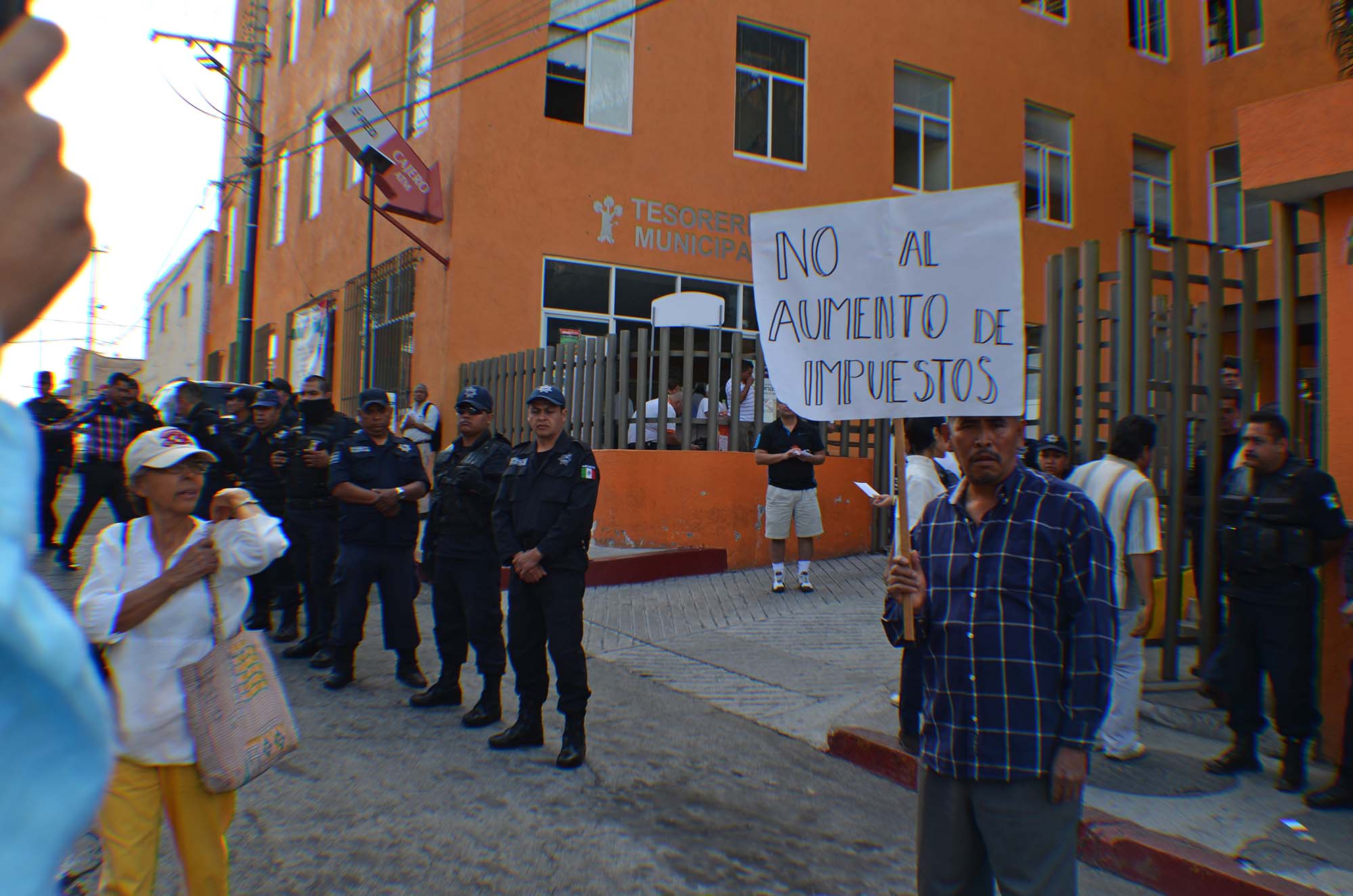 Cuernavaca, Morelos; 20 de febrero de 2014. Cerca de 30 granaderos bloquean la entrada de las oficinas de Tesorería del Ayuntamiento capitalino para evitar que integrantes del Frente Municipal de Cuernavaca contra los Incrementos a los Derechos por Servicios Públicos Municipales bloqueen la entrada a usuarios que deseen pagar sus impuestos.