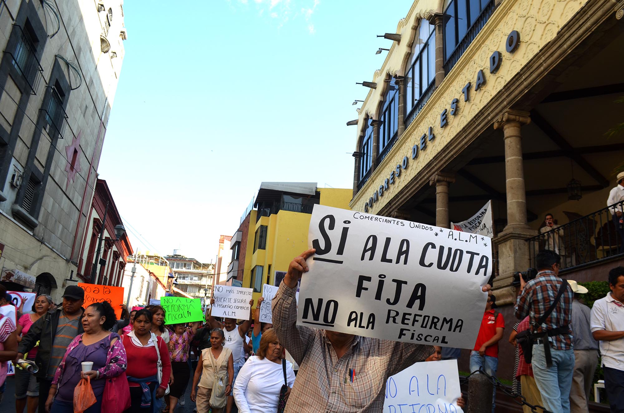 Con pancartas y gritos, los comerciantes manifestaron su inconformidad es porque esta Reforma Fiscal “acabaría con el patrimonio de los pequeños comercios debido que de 300 pesos que pagaban, con esta reforma criminal tendrán que pagar 2,800 pesos bimestrales que da una suma total de 16,200 pesos al año”