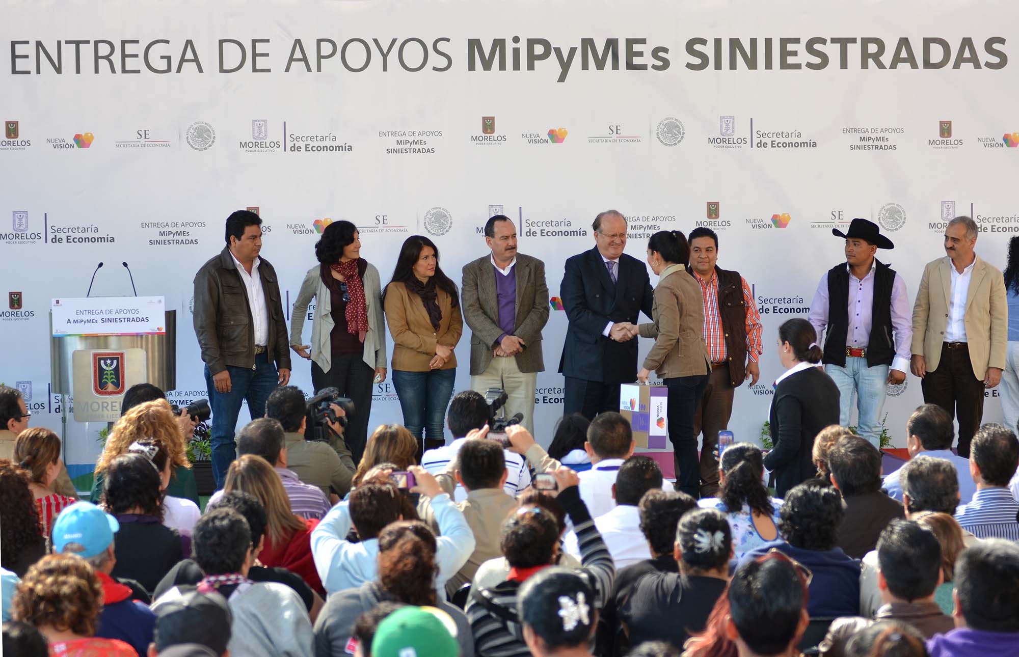 La entrega de los apoyos, realizada en la Plaza de Armas “Emiliano Zapata” de Cuernavaca estuvieron presentes el secretario de Gobierno, Jorge Messeguer Guillén; el secretario de Economía estatal, Julio Mitre Cendejas y la delegada de Economía en Morelos, Hilda Aurora Trujillo.