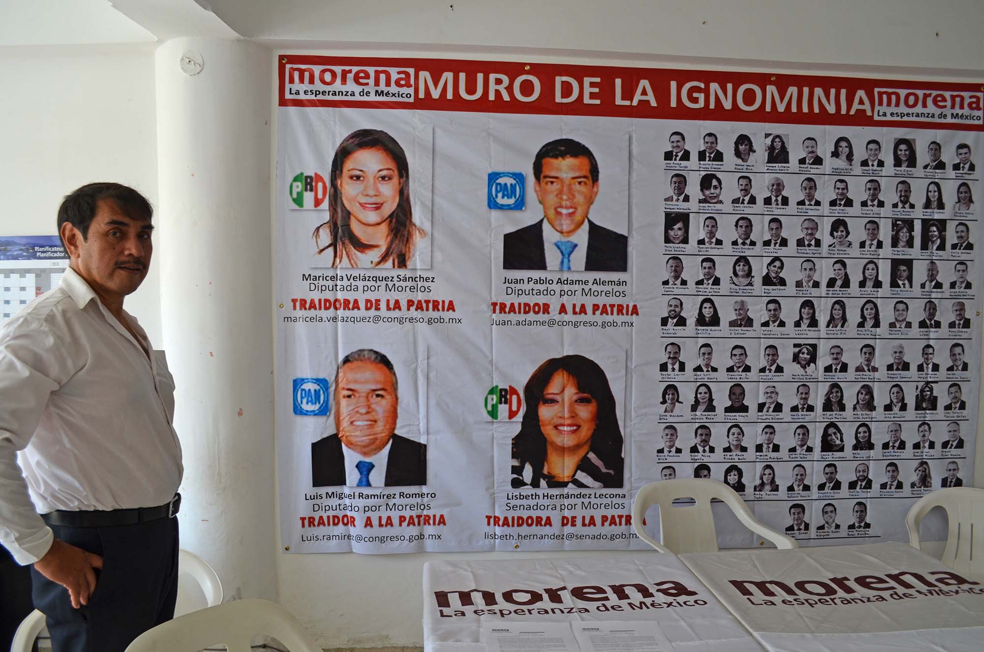 Cuernavaca, Morelos; 13 de febrero de 2014. La organización política Movimiento Regeneración Nacional exhibirá a los diputados Maricela Velázquez Sánchez, Miguel Ángel Ramírez Romero, Juan Pablo Adame Alemán, del PRI y del PAN, así como a la senadora priista Lisbeth Hernández Lecona, en una manta denominada “Muro de la ignominia”, ya que votaron en favor de la reforma energética propuesta por Enrique Peña Nieto, la cual se considera como una traición a la patria, aseveró Cristóbal Vargas Morales, consejero nacional de la organización política Morena.