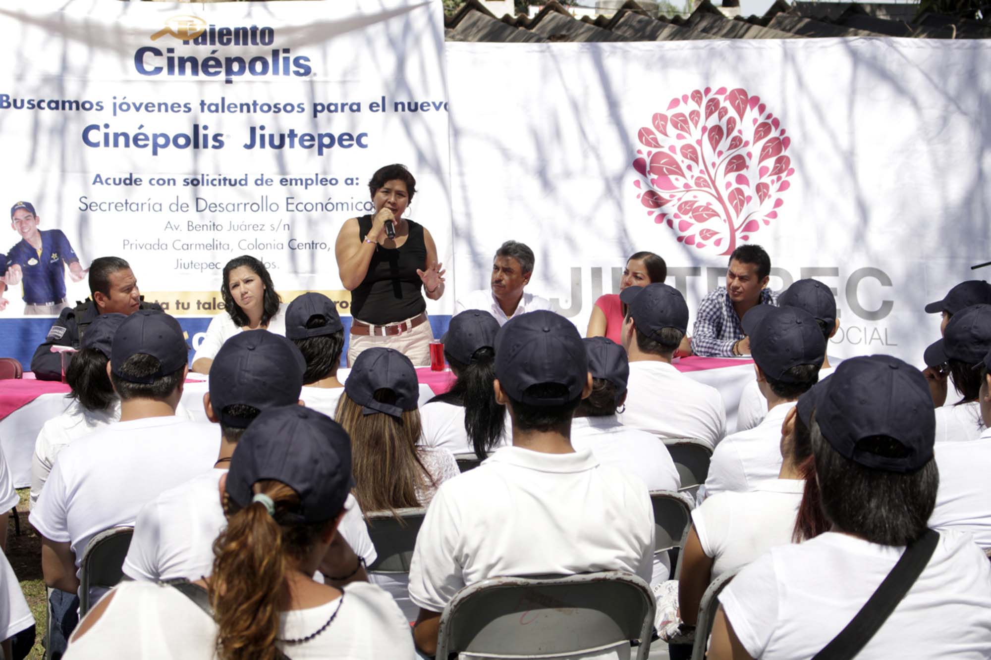 En su turno, en representación de la Presidenta Municipal de Jiutepec Silvia Salazar Hernández, la Presidenta para el Desarrollo Integral de la Familia DIF Jiutepec Yolanda Salazar Hernández reconoció el compromiso de la empresa Cinepolis por colaborar con el gobierno municipal para ofrecer empleo a las y los jóvenes, “siempre es grato poder colaborar con empresas que están comprometidas a que juntos transformemos a Jiutepec en una Ciudad Con Sentido Social; la vida siempre tiene retos y precisamente ustedes jóvenes tienen la encomienda de construir una mejor comunidad a través del trabajo digno, la colaboración, que todos los días tengan de trabajar, de decir si quiero estudiar, si quiero ser parte de un Jiutepec donde todas y todos nos damos la mano para apoyarnos” enfatizó Salazar Hernández.