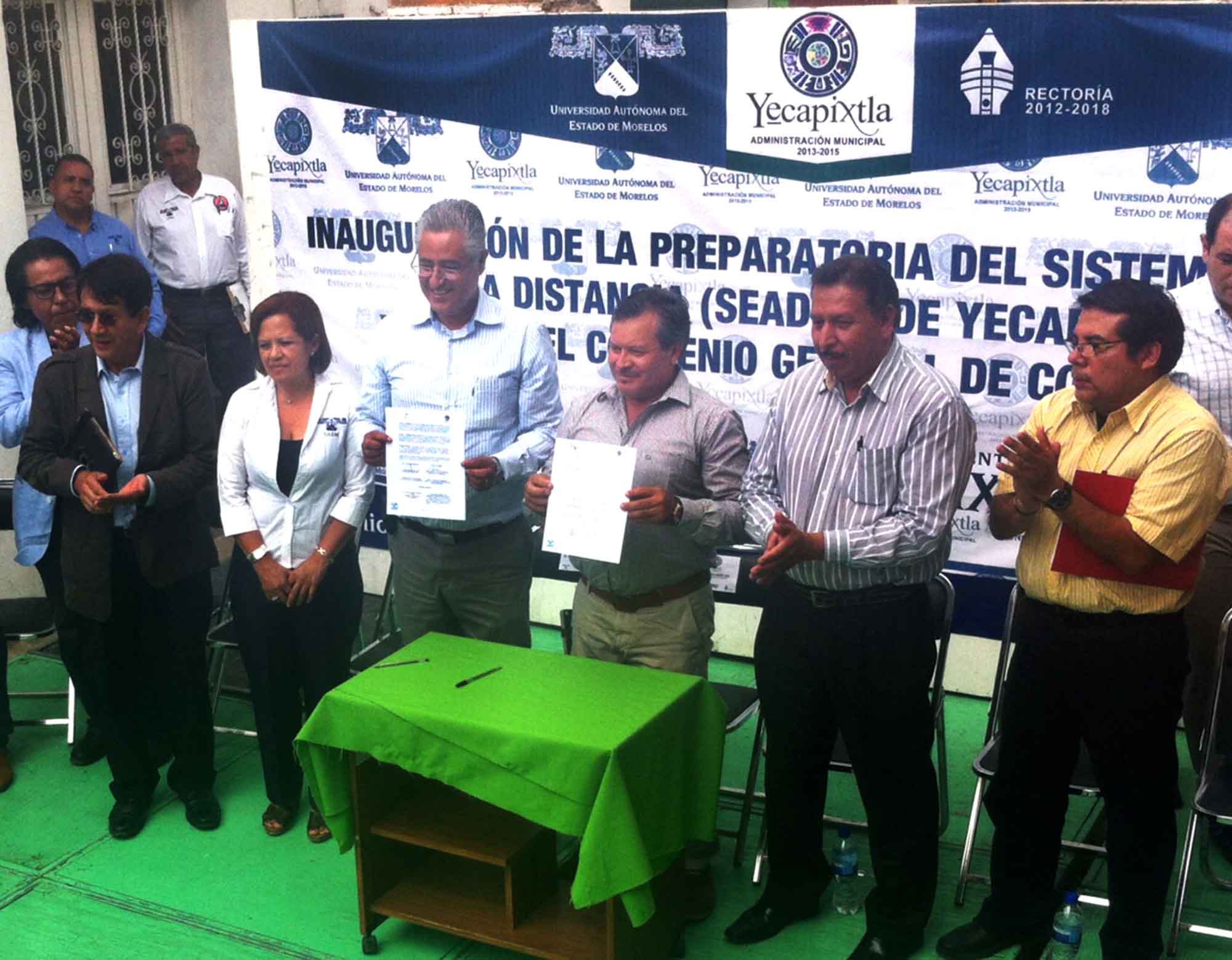 Yecapixtla, Morelos; 24 de junio de 2014. El Rector de la Universidad Autónoma del Estado de Morelos (UAEM), Jesús Alejandro Vera Jiménez de manera conjunta con el presidente municipal de Yecapixtla, Refugio Amaro Luna, inauguraron las instalaciones del Sistema de Educación Abierta y a Distancia (SEAD) en Yecapixtla y otorgaron cinco becas a igual número de elementos de Dirección de Seguridad Pública y Tránsito Municipal.