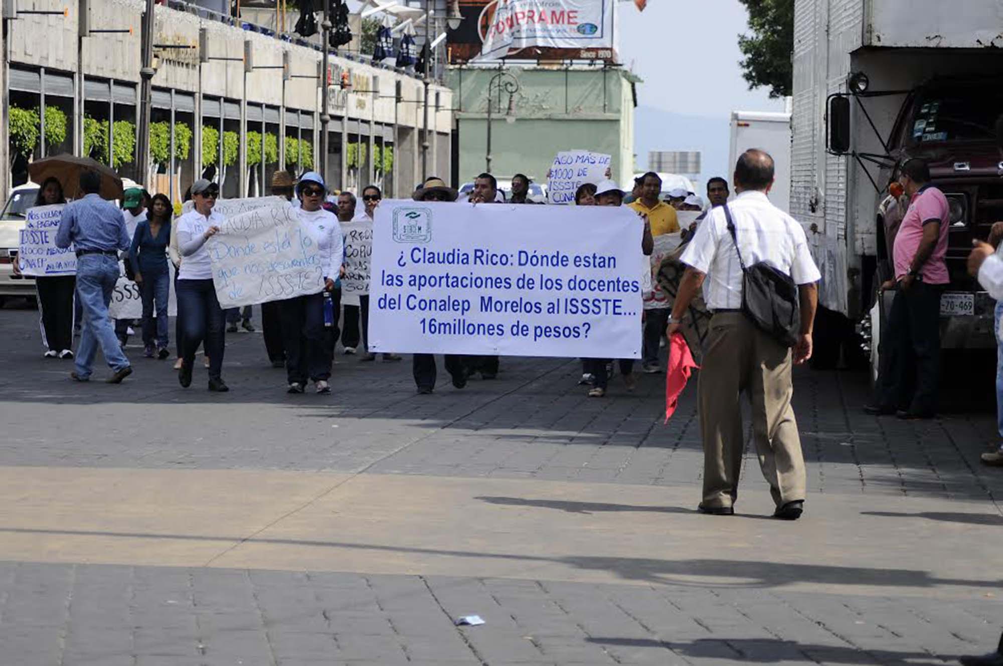 Cuernavaca, Morelos, 14 de noviembre de 2014. Trabajadores sindicalizados del Colegio Nacional de Educación Profesional (CONALEP) marcharon de Plaza Solidaridad al zócalo de Cuernavaca, como un recordatorio a la autoridad de que atiendan su pliego petitorio, de lo contrario el martes estallará la huelga.