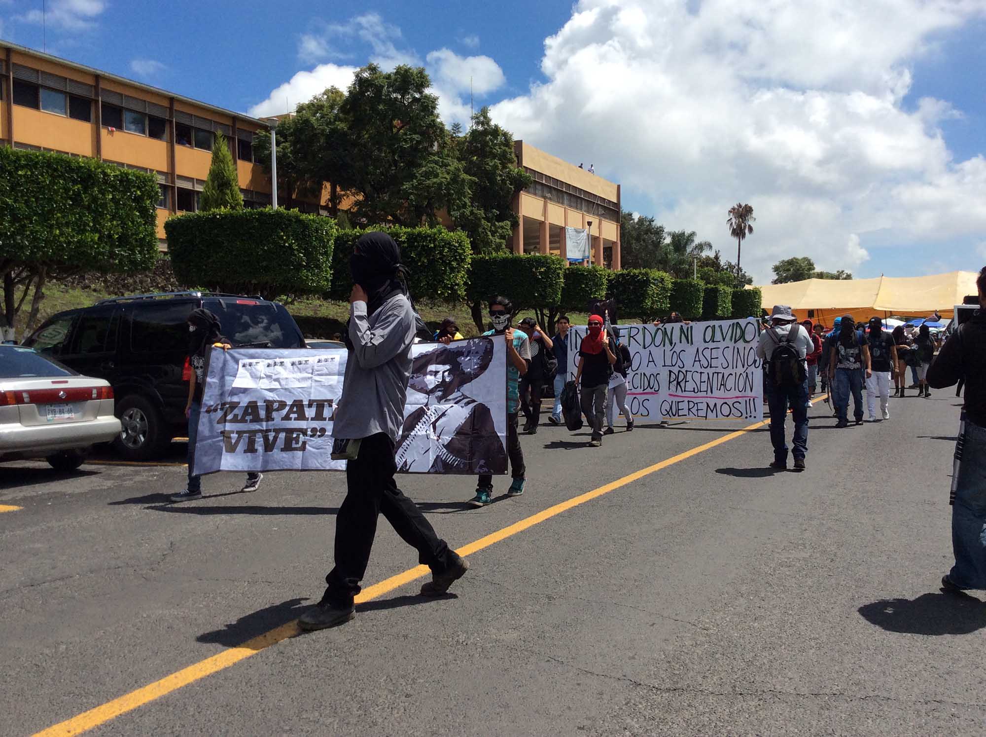 Poco después del medio día, un grupo reducido de estudiantes partió desde a Máxima Casa de Estudios en Morelos algunos encapuchados, acompañados de mantas, banderas rojinegras, globos con pintura y semillas hasta la 24 Zona Militar.