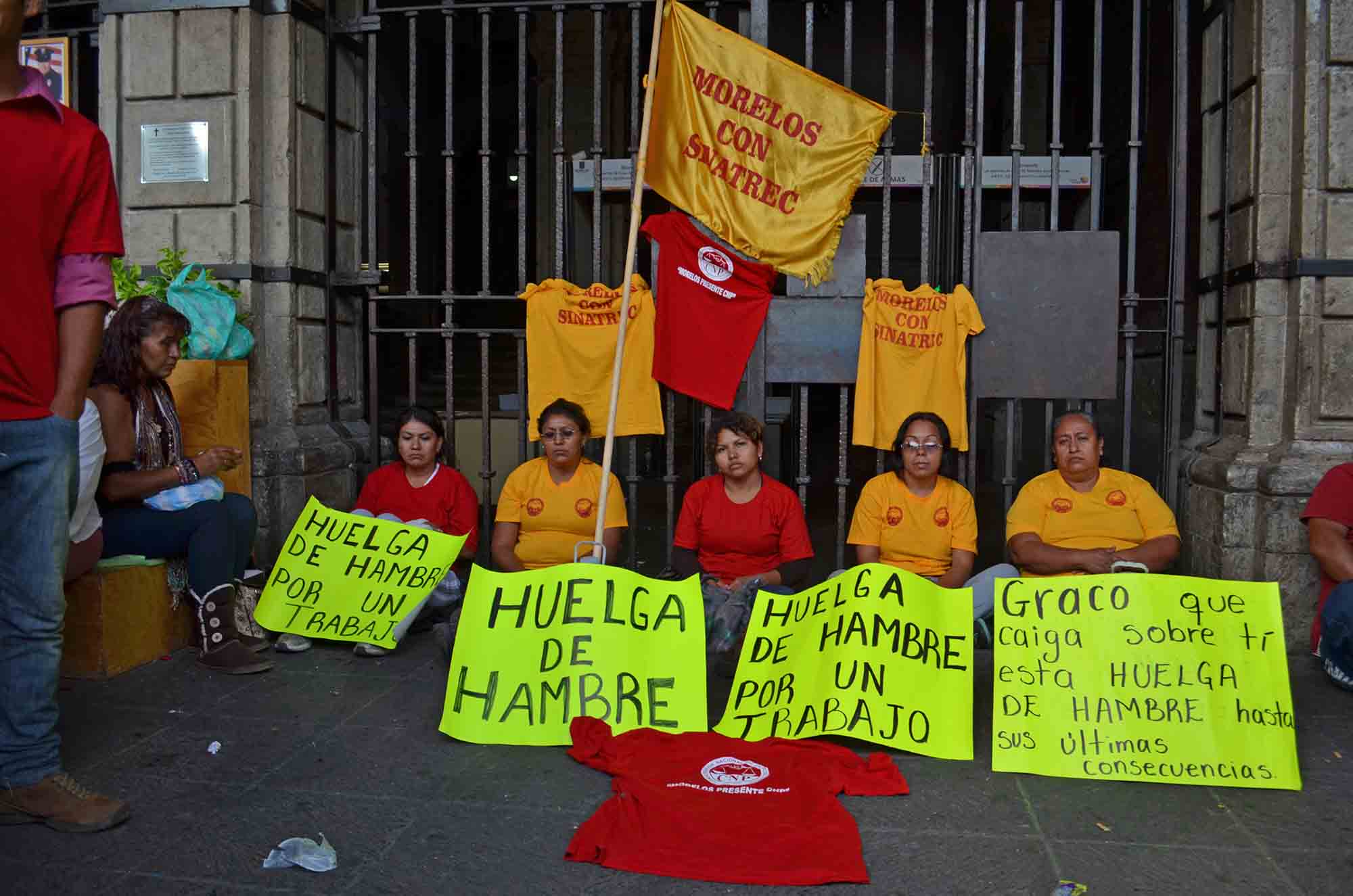 Cuernavaca, Morelos; 5 de agosto de 2014. Cincuenta mujeres del Sindicato Nacional de Trabajadores, Empleados, Choferes, Transportistas y Obreros de la Construcción en General (SINATREC) se pudieron en huelga de hambre frente a las puertas del palacio de gobierno para pedir al gobernador del Estado Graco Ramírez empleos en la construcción de la autopista Siglo XXI.