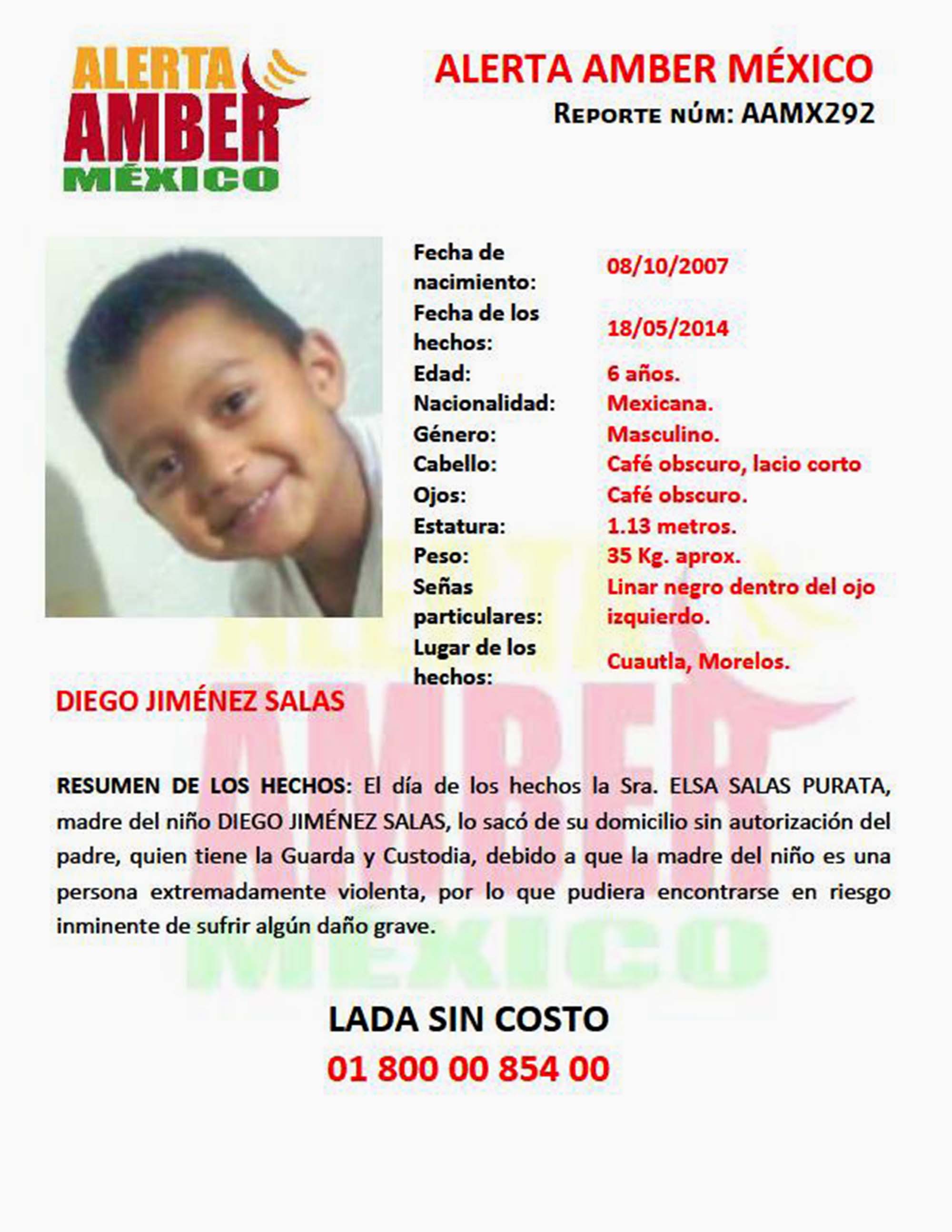 Otra alerta se refiere al niño de seis años, Diego Jiménez Salas, de Cuautla; y el teléfono para informes es 01 800 0085400.