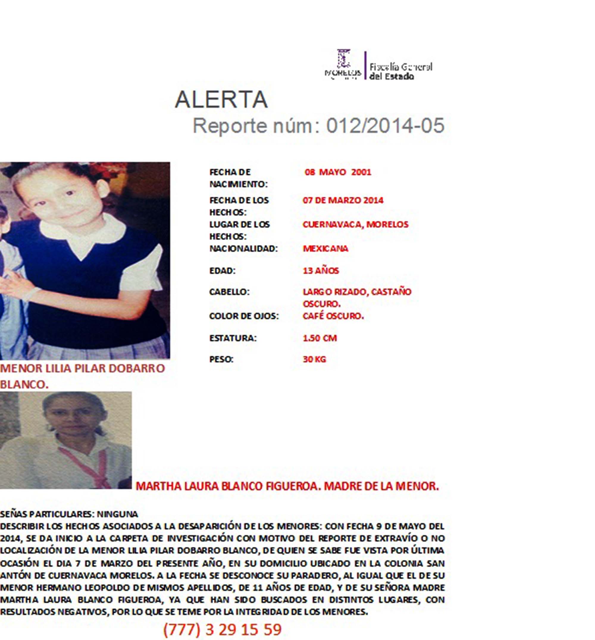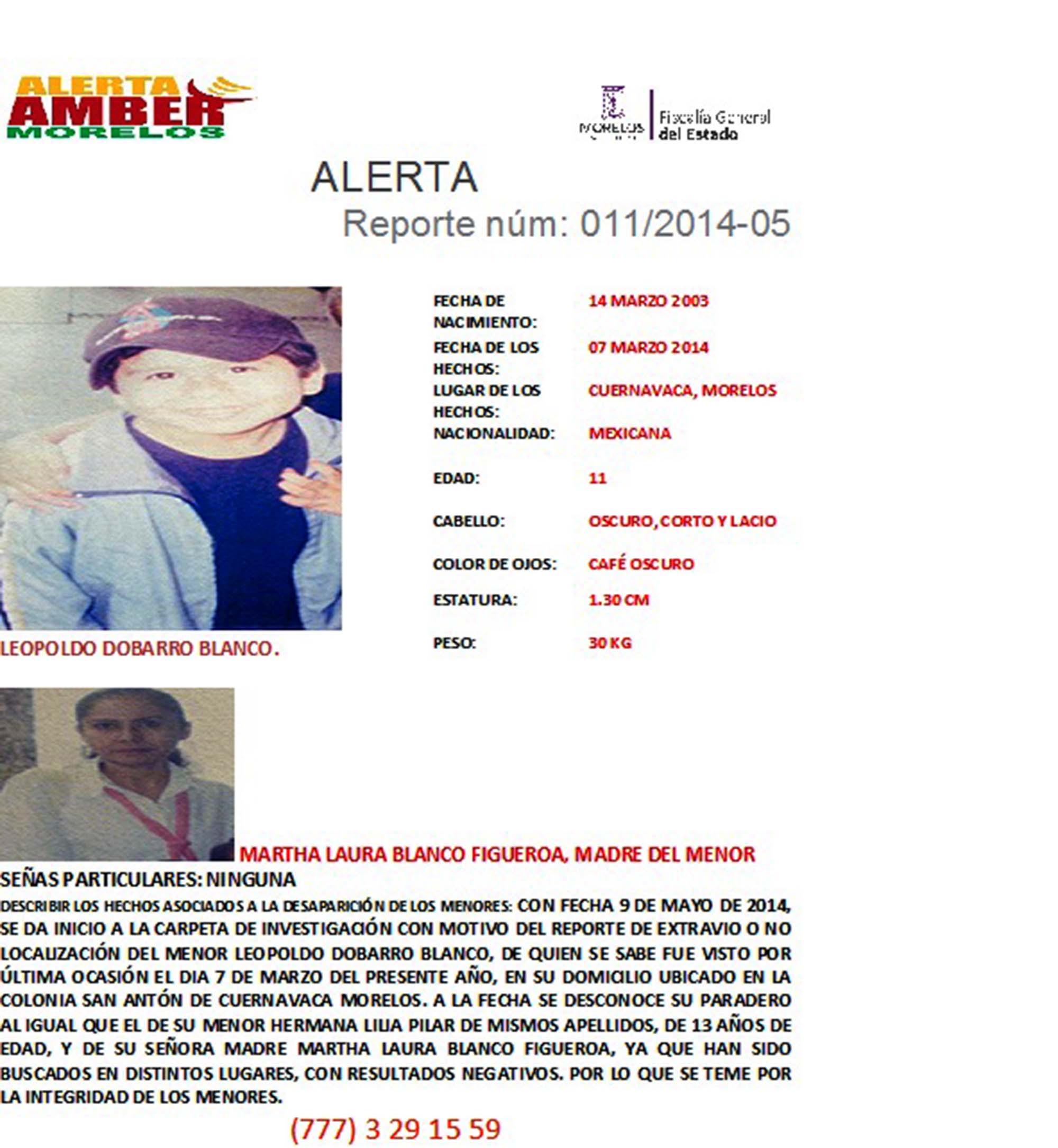 Cuernavaca, Morelos; a 23 de mayo de 2014. Por medio de un comunicado, la Fiscalía General Morelos emitió dos alerta Amber, solicitando el apoyo de la ciudadanía para localizar a los hermanos Leopoldo Dobarro Blanco y Lilia Pilar Dobarro Blanco, de 11 años y 13 años, respectivamente.