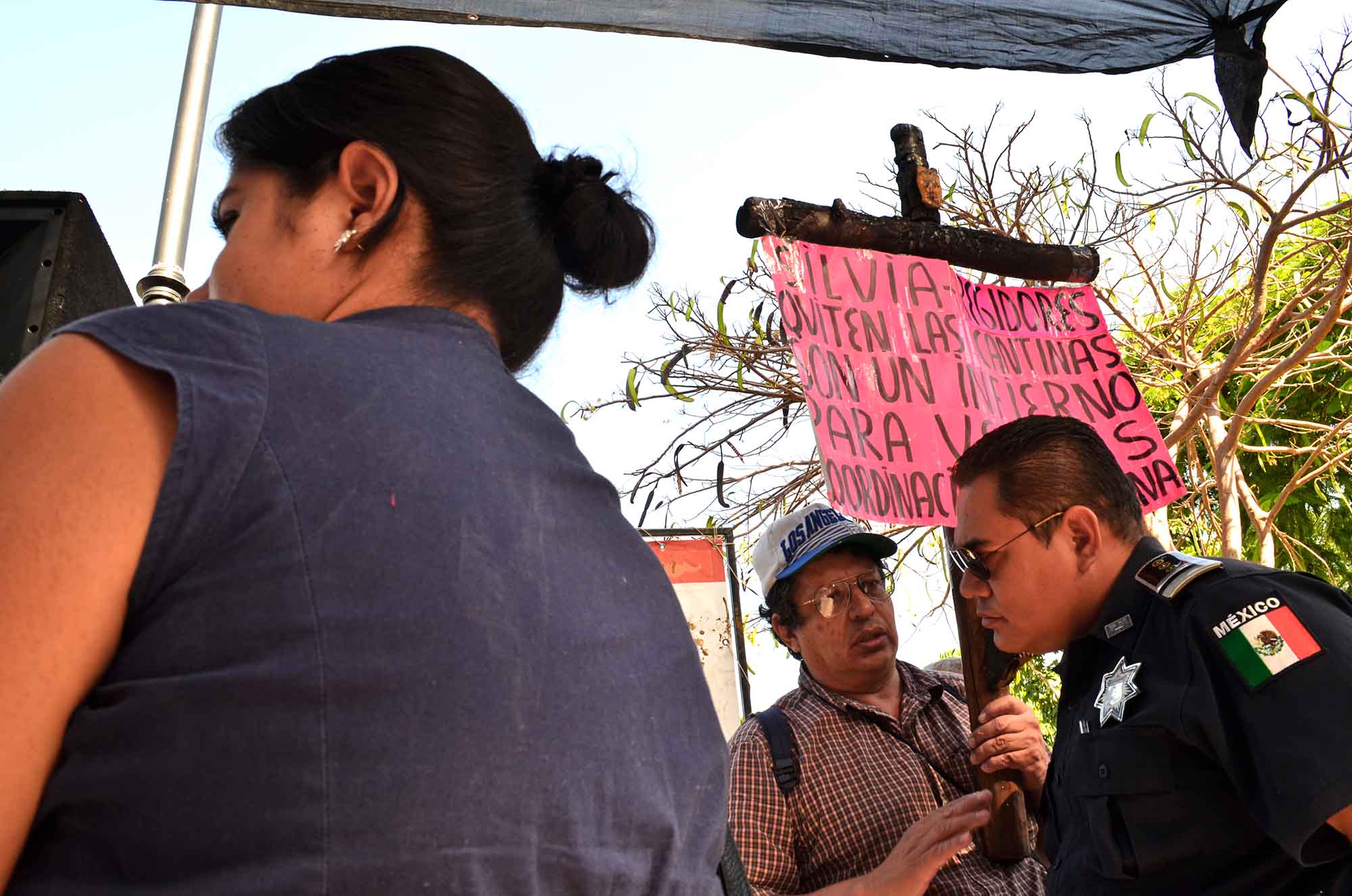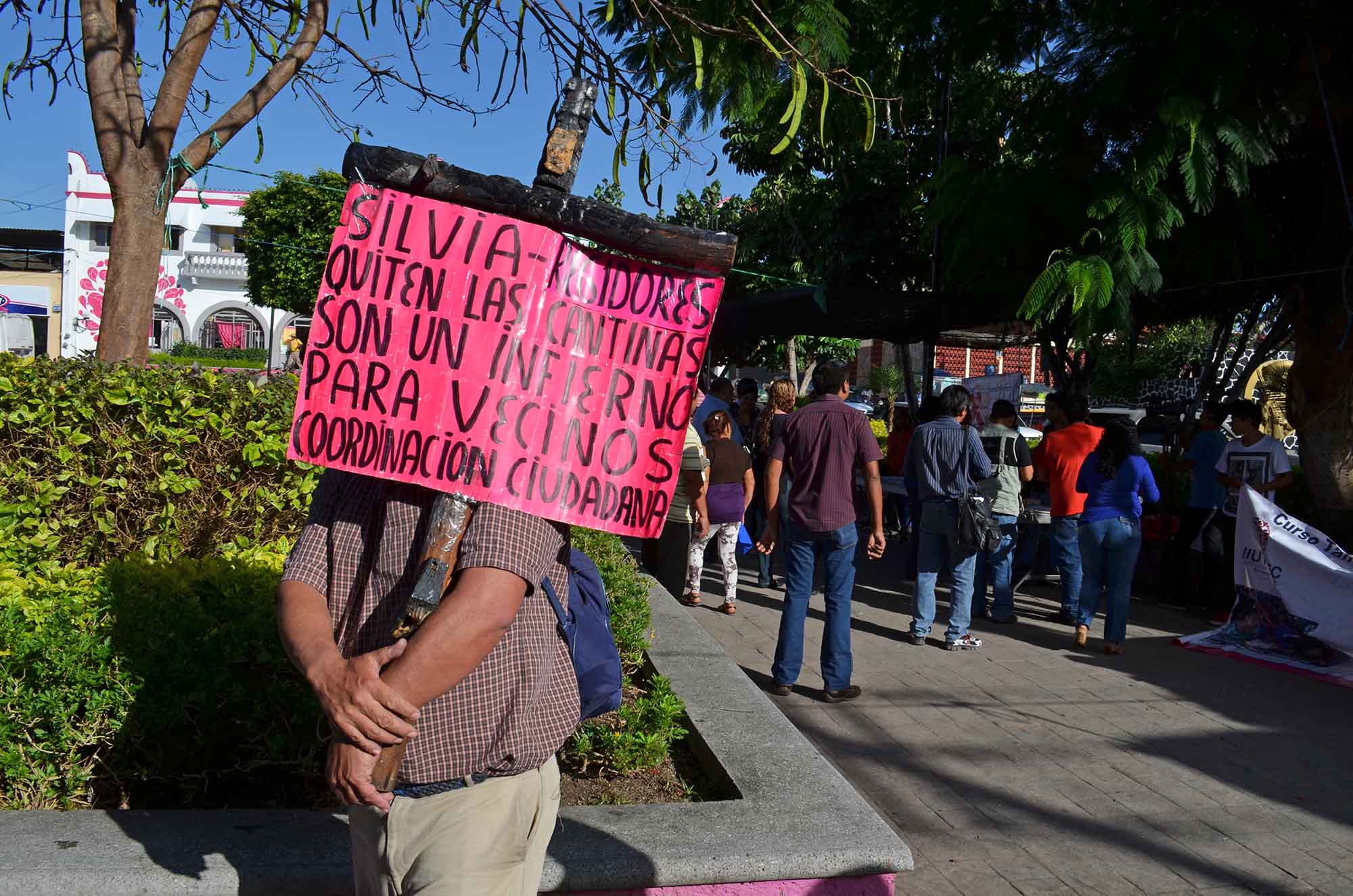 El hombre que no quiso dar su nombre porque dijo que lo tienen “amenazado de muerte los dueños de los antros”, con una cartulina pegado a una cruz de madera quemada dijo que es insoportable el ambiente que hay en el centro de Tejalpa debido a que esas cantinas funcionan las 24 horas del día “a veces a puertas abiertas y a veces cerradas, ya que además de borrachos que molestan a las personas hay putas que trabajan en las cantinas y afuera de ellas. Además el ruido que hacen por las noches no dejan dormir y es infernal”, explicó esta persona.