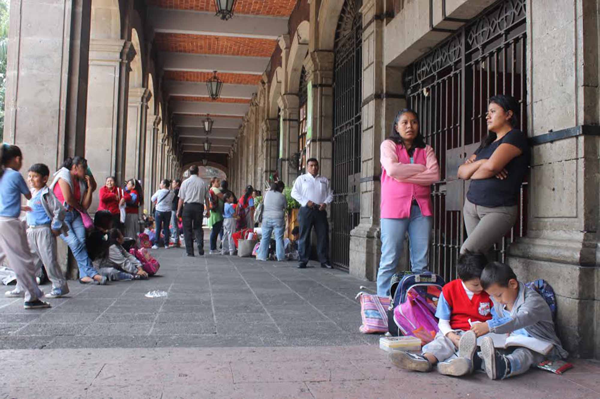 Cuernavaca, Morelos; 10 de diciembre de 2014. Padres de familia y estudiantes de la escuela primaria 17 de abril del municipio de Xochitepec protestaron afuera de Palacio de Gobierno, exigieron la construcción de tres aulas y una barda perimetral porque sus hijos toman clases en salones de cartón.