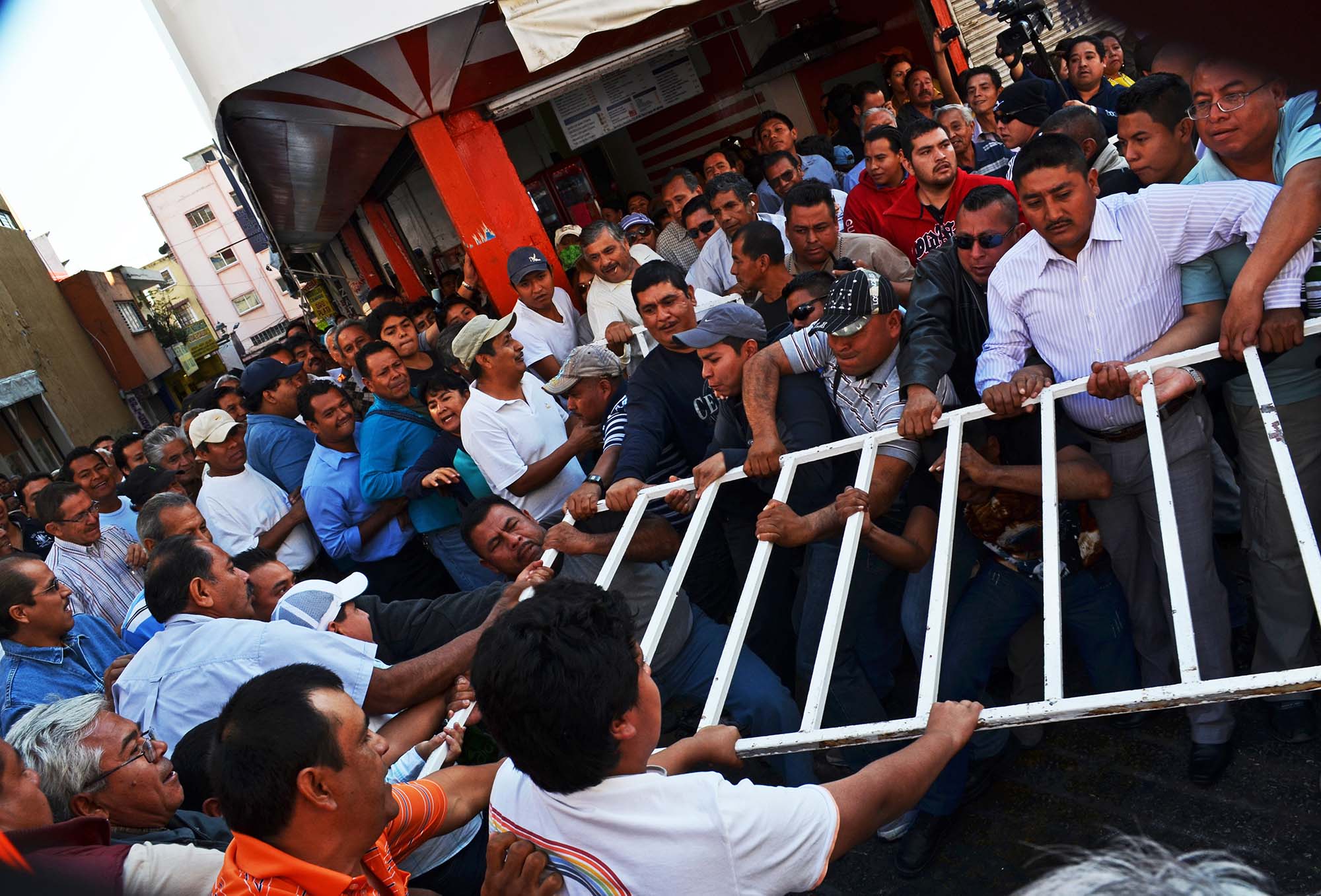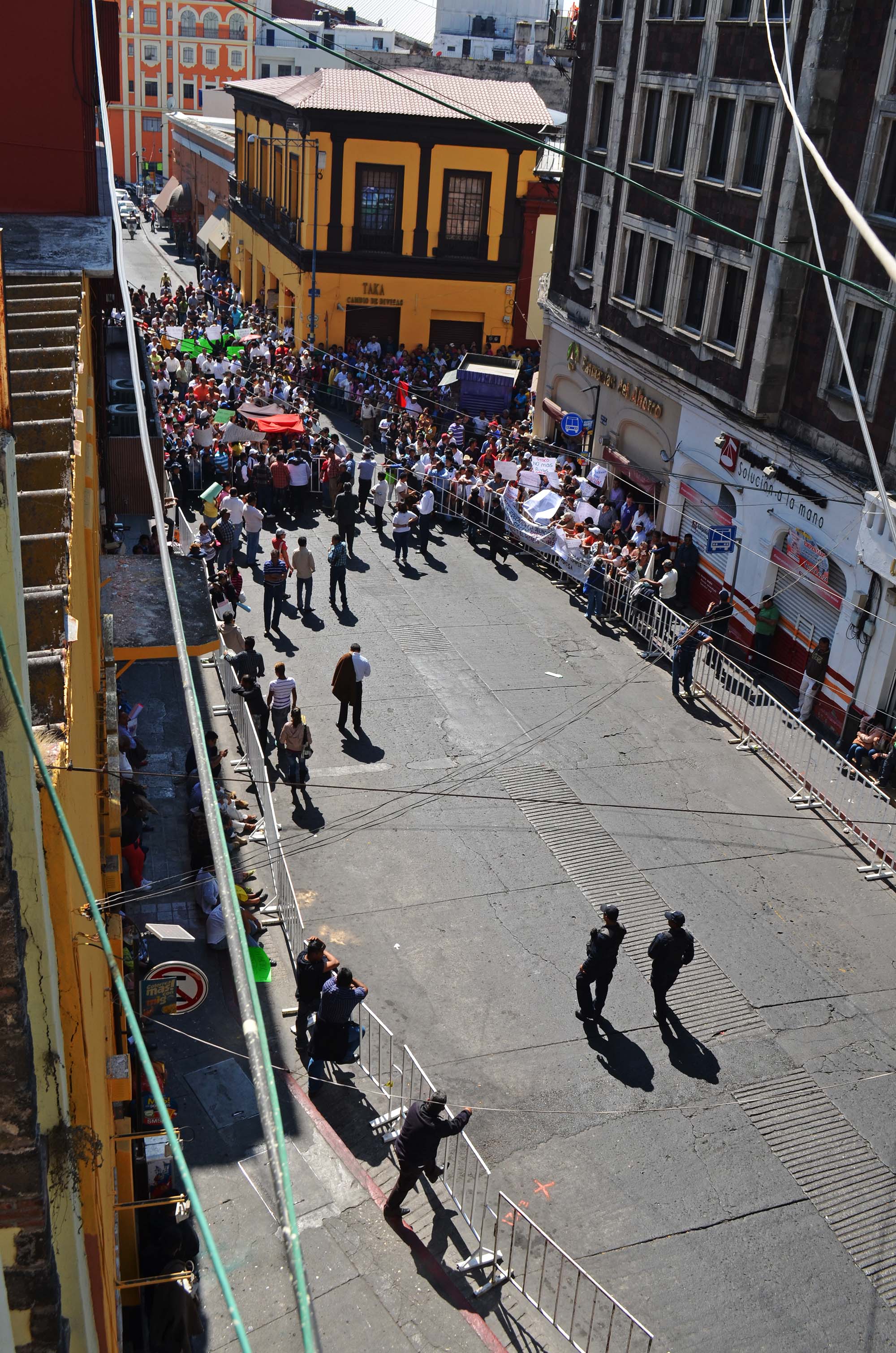 Antes de la Apertura del Periodo Ordinario de Sesiones del Congreso del Estado, programada a las 10d e la mañana pero que comenzó más de una hora después, líderes ruteros y choferes de transporte público, a empujones y jalones, desbloquearon tres vallas que el gobierno había mandado a instalar para que ningún manifestantes se introdujera al recinto legislativo. Había rejas de metal que los inconformes levantaron y arrebataron a policías vestido de civil, que resguardaban el local del Congreso varias cuadras a la redonda.