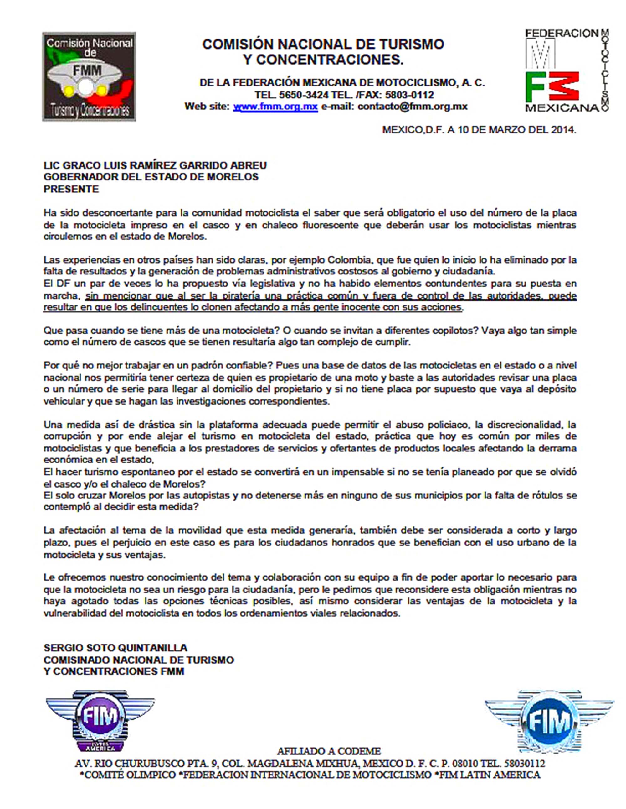 Sergio Soto Quintanilla, comisionado nacional de Turismo y Concentraciones de la Federación Nacional de Motociclismo A. C., dio a conocer que en vez de esta prohibición se debería optar por un padrón federal confiable con el cual las autoridades puedan identificar quién es el propietario de la motocicleta.