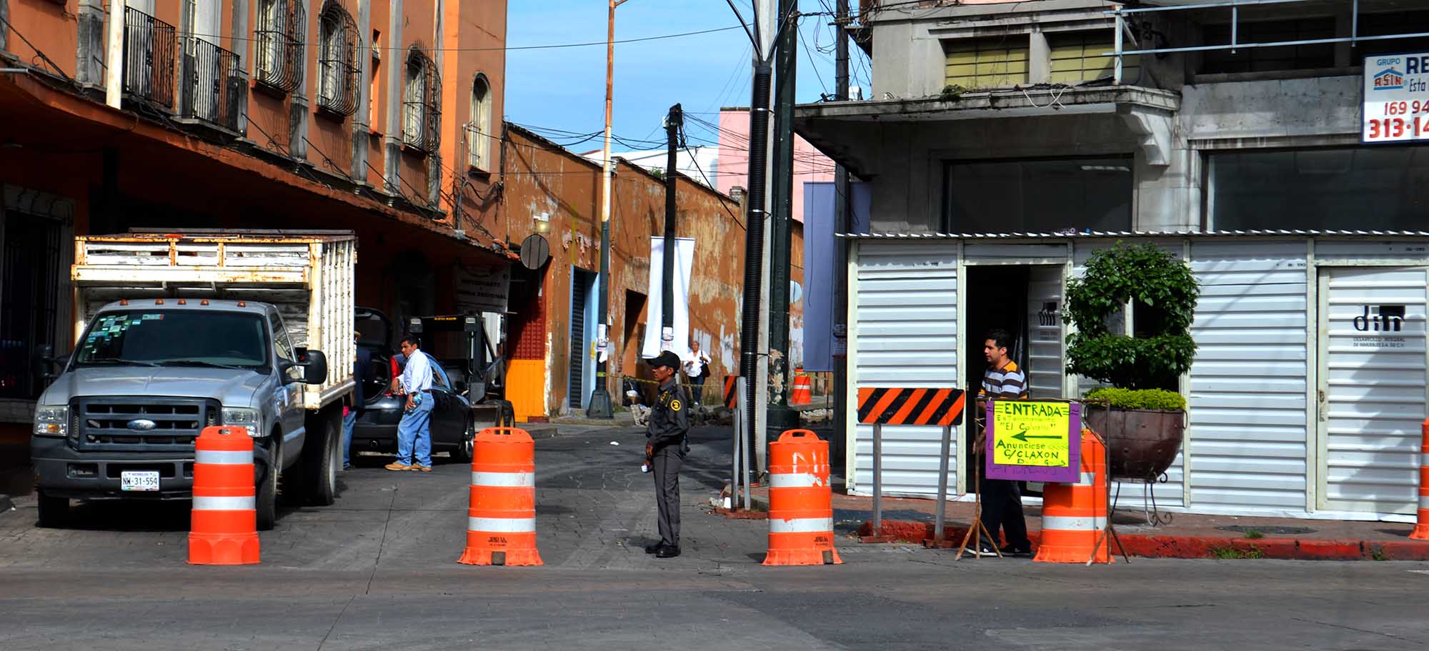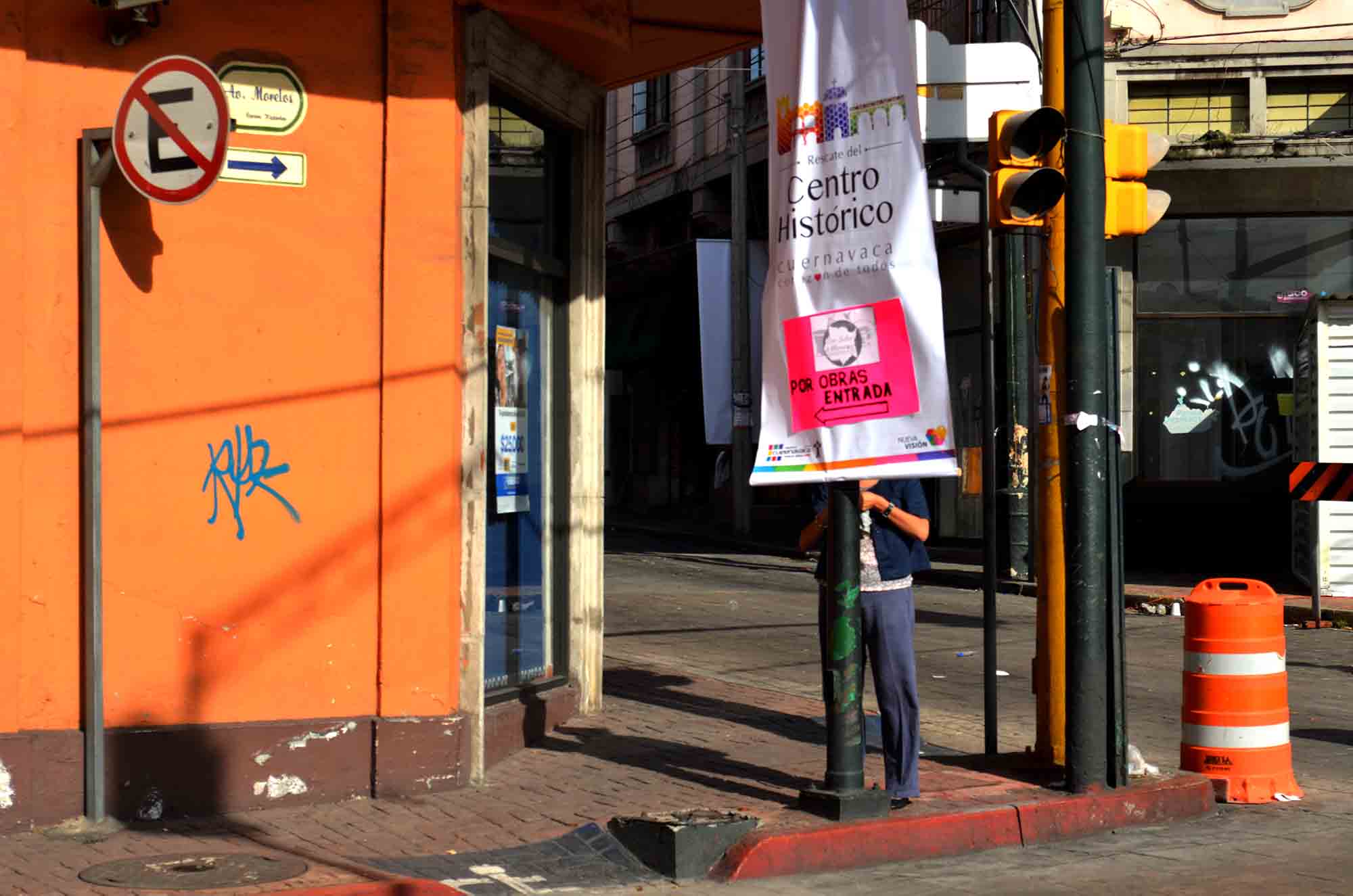 Rocío Cruces, dueña del restaurante de Comida Tradicional Con Sabor a Morelos ubicado en la calle Ricardo Linares, dijo el día del inicio de los trabajos del Programa de Recuperación de la Imagen del Centro Histórico de Cuernavaca -4 de agosto-, que no les habían avisado del cierre de esa calle por más de 12 semanas y que el Gobierno no les había ofrecido apoyo alguno, por ello salió a pegar anuncios sobre pendones colgados por el Gobierno.