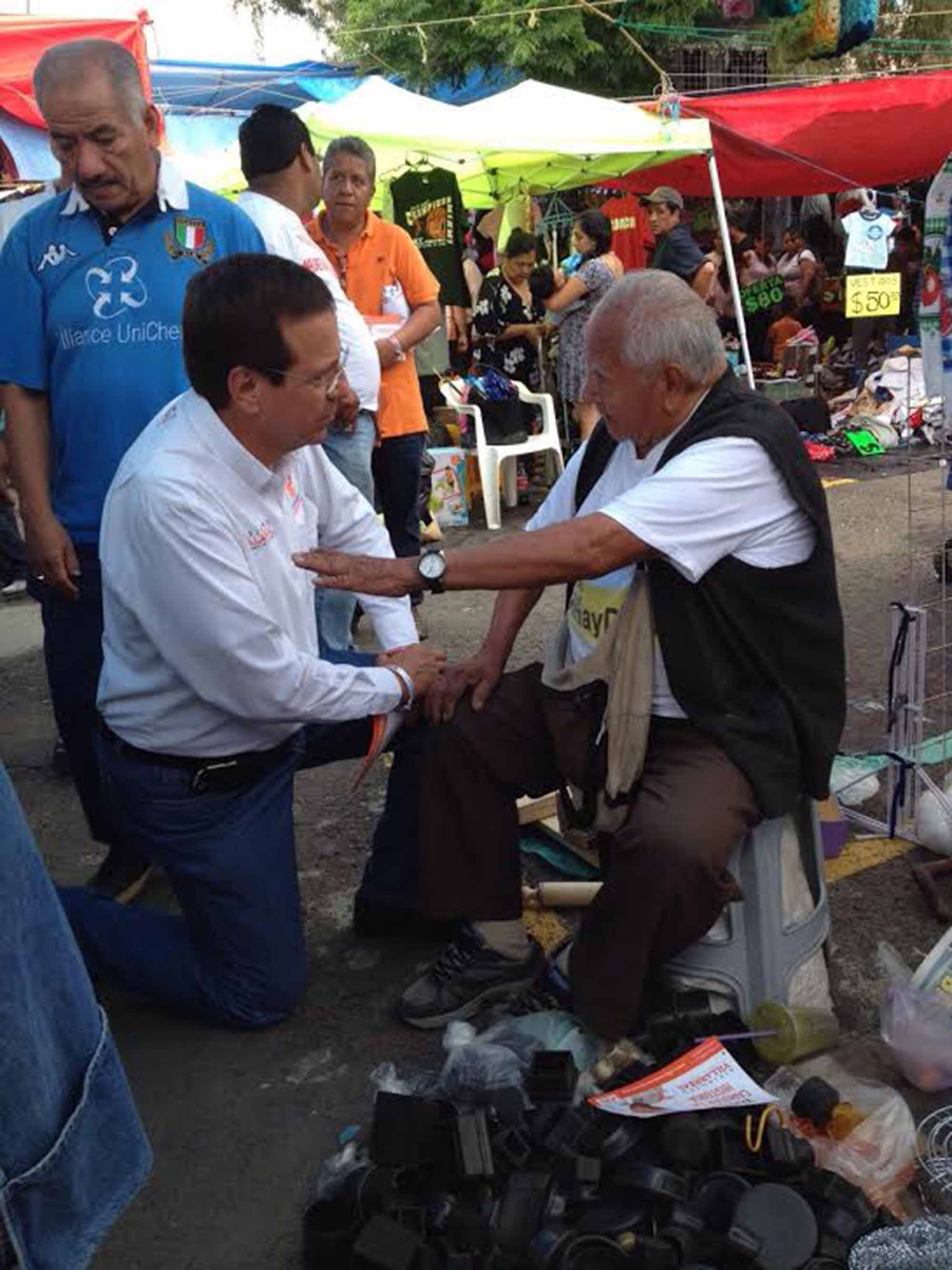 El candidato de Movimiento Ciudadano indicó que como en otras partes del estado, es necesario hacer una revisión a la situación jurídica de los tianguistas ya que al pagar cuotas a autoridades municipales para permitirles instalarse en estos lugares, llegarían a ganar derechos como comerciantes formales, por lo que se buscaría un mecanismo para que reciban los beneficios como contribuyentes al municipio.