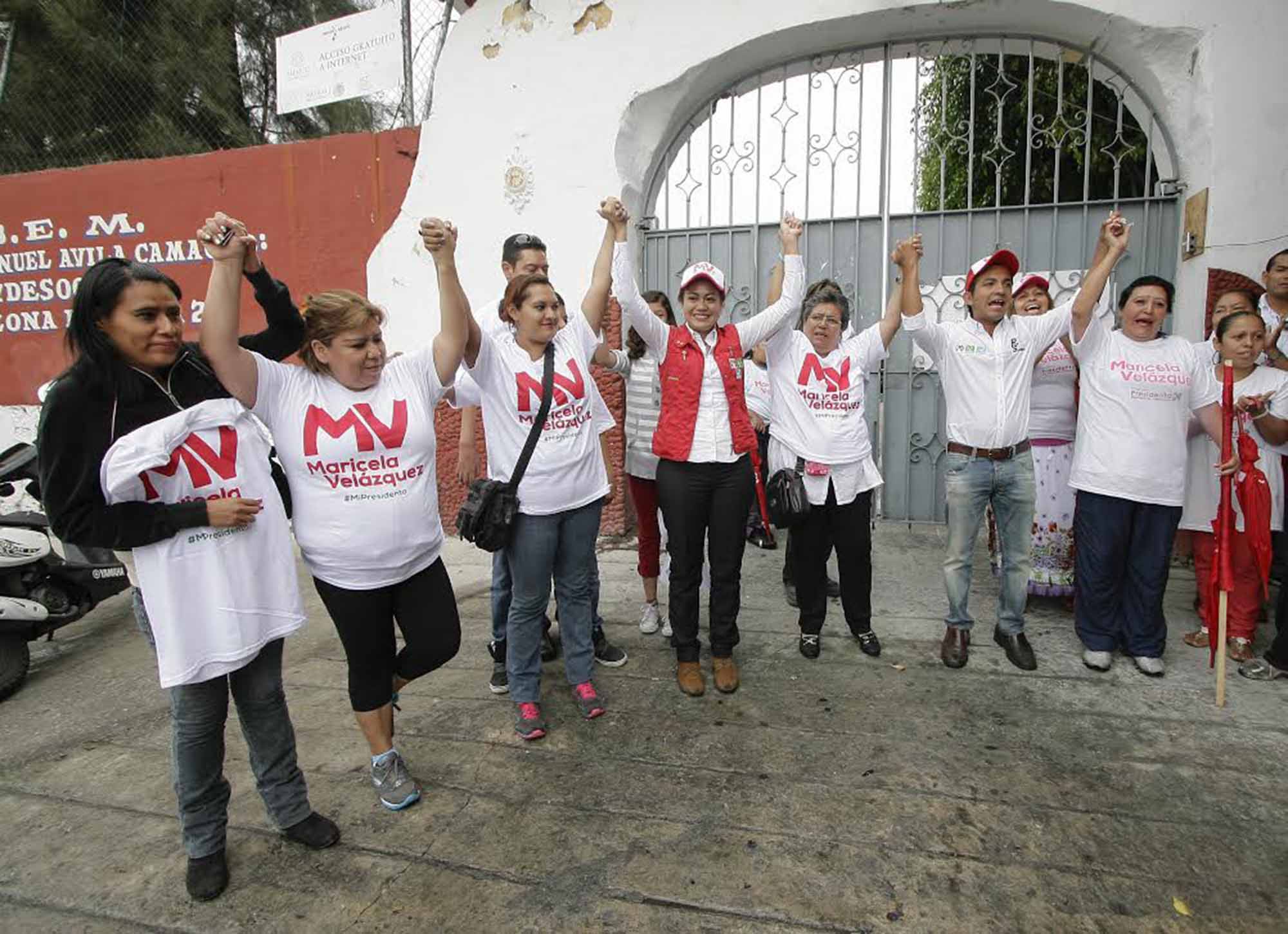 Cuernavaca, Morelos; 24 de mayo de 2015. Hartas de los malos tratos, la prepotencia y misoginia, doce líderes perredistas que encabezan a un grupo de 800 personas del cuarto distrito, se adhirieron al proyecto de la candidata de la coalición PRI, Verde Ecologista y Nueva Alianza, Maricela Velázquez Sánchez, mientras realizaba su recorrido por la colonia Carolina.