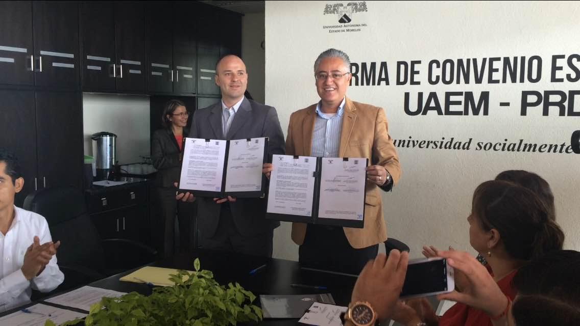 Cuernavaca, Morelos; 14 de julio de 2015. La Universidad Autónoma del Estado de Morelos y el Partido de la Revolución Democrática (PRD) firmaron hoy un convenio de colaboración en el que se sientan las bases para que la institución desarrolle el diplomado sobre “La Nueva Gestión Pública Municipal” con autoridades electas municipales de dicho instituto político.