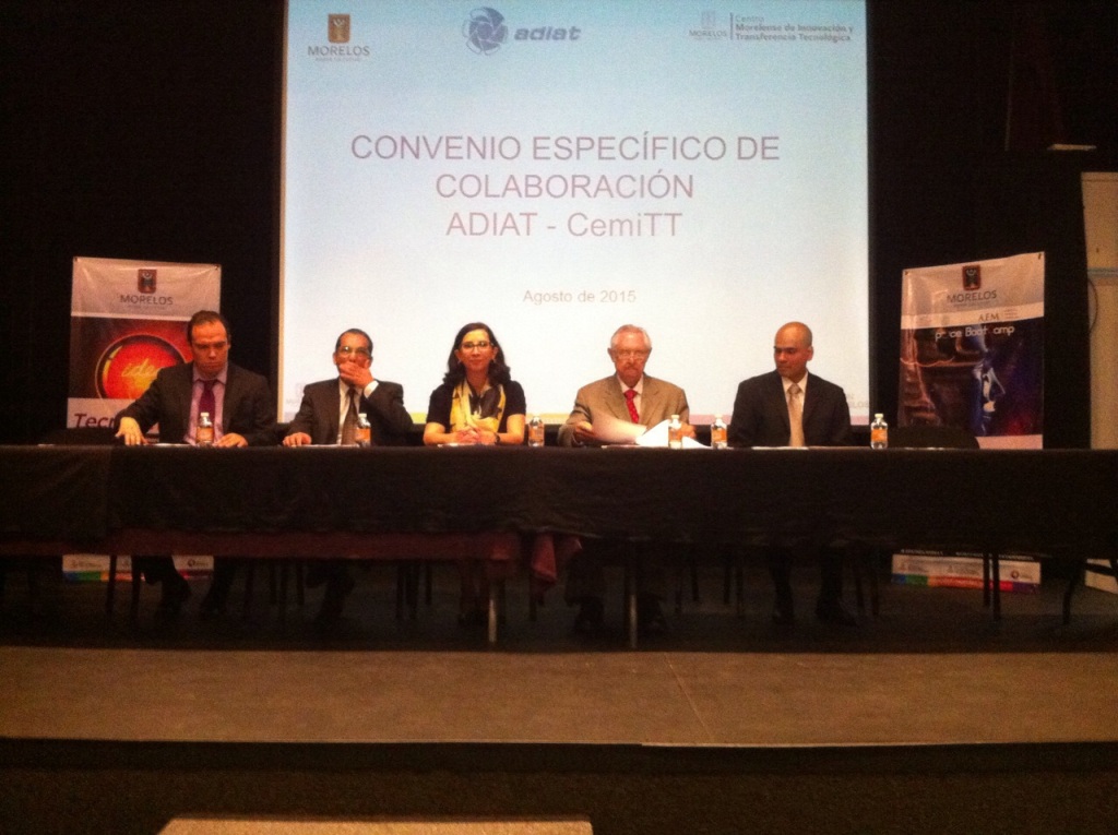 Cuernavaca, Morelos; 10 de agosto de 2015. “Tenemos la meta de impulsar la innovación y la economía del conocimiento en Morelos, y a esta labor se han sumado organizaciones como la Asociación Mexicana de Directivos de la Investigación Aplicada y el Desarrollo Tecnológico (ADIAT)”, señaló Brenda Valderrama Blanco, secretaria de Innovación, Ciencia y Tecnología (SICyT), en el marco de la firma de convenio de colaboración entre la misma y el Centro Morelense de Innovación y Trasferencia Tecnológica (CemiTT).