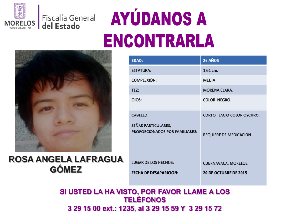 En la conferencia se presentó y difundió por las redes sociales, la ficha técnica de Rosa Angélica Lafragua Gómez, quien cuenta con 26 años de edad, es de tez morena clara, ojos color negro, usa cabello corto, lacio, de color oscuro, como señas particulares refiere que necesita de medicamentos y desapareció el pasado 20 de octubre en Cuernavaca, Morelos.
