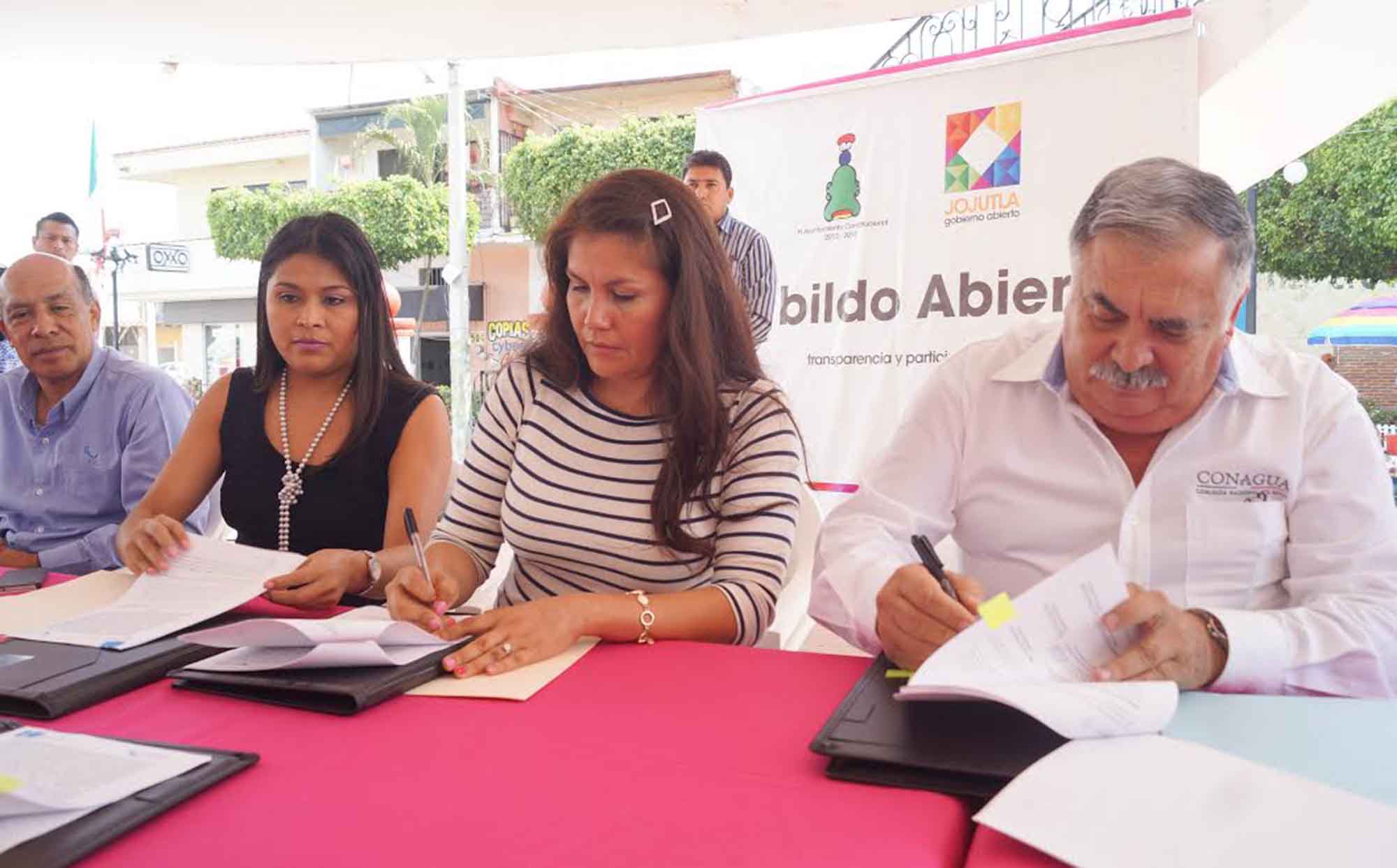 Jojutla, Morelos; 27 de enero de 2015. Con una inversión de 3 millones de pesos se construirá, en la colonia Guadalupe Victoria de la comunidad de Tehuixtla, una Planta de Tratamiento de aguas residuales, por lo que esta mañana la presidenta de Jojutla, Hortencia Figueroa Peralta, junto con el director de la Comisión Nacional del Agua (CONAGUA) Organismo Cuenca Balsas, Jorge Malagón; el director del Instituto Mexicano de Tecnología del Agua (IMTA) Víctor Bourguett y José Alejandro Muñoz de la empresa Hitecma, S.A de C.V; signaron un convenio de colaboración.