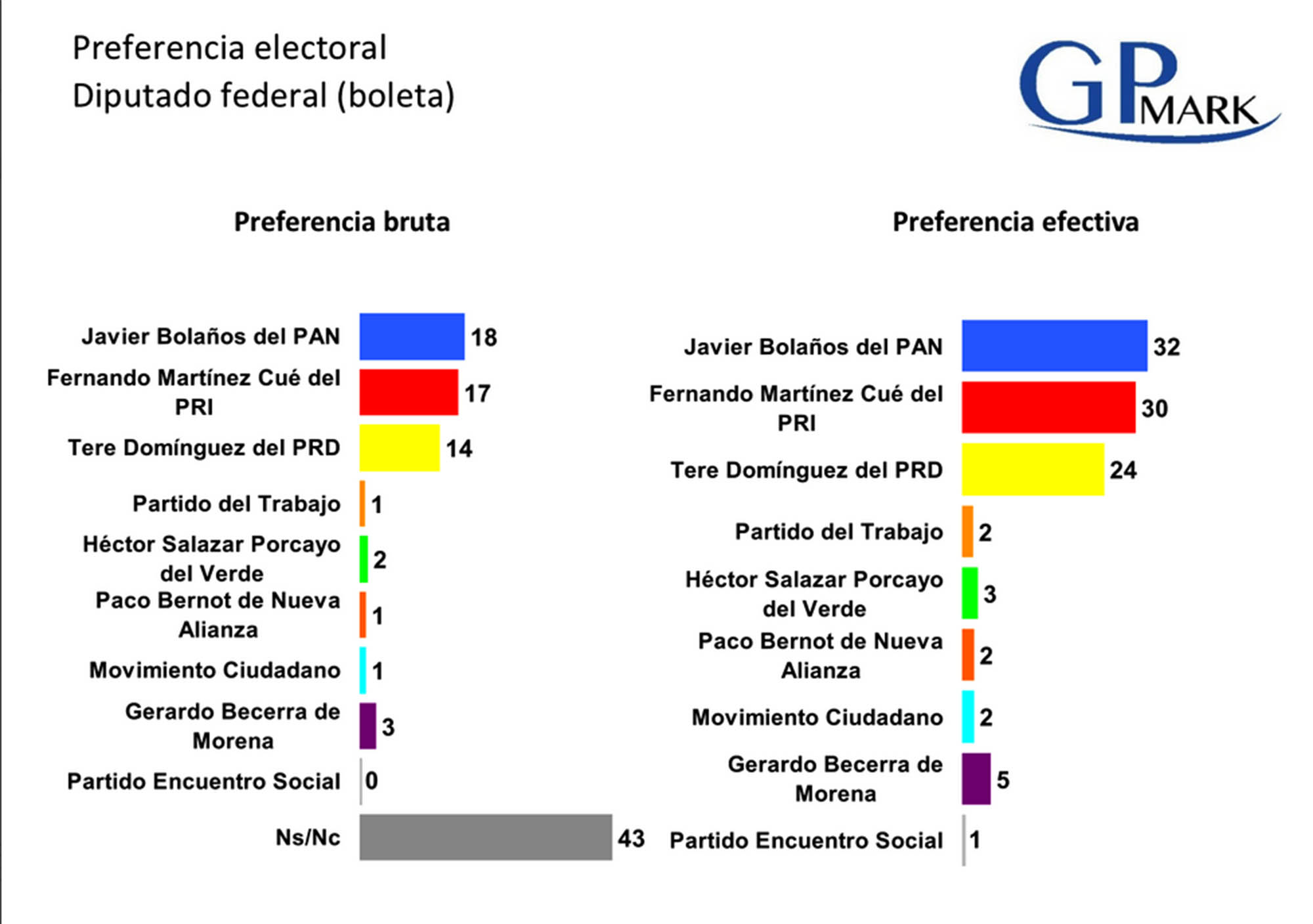 Derivado de una encuesta encargada a la empresa GP MARK, el candidato de Acción Nacional supera en preferencia1 a sus más cercanos contendientes del PRI y del PRD, por lo que aseguró que el domingo 7 de junio, Acción Nacional podría alzarse con la victoria en el distrito electoral más importante por ser la capital del estado, entre otras cosas.