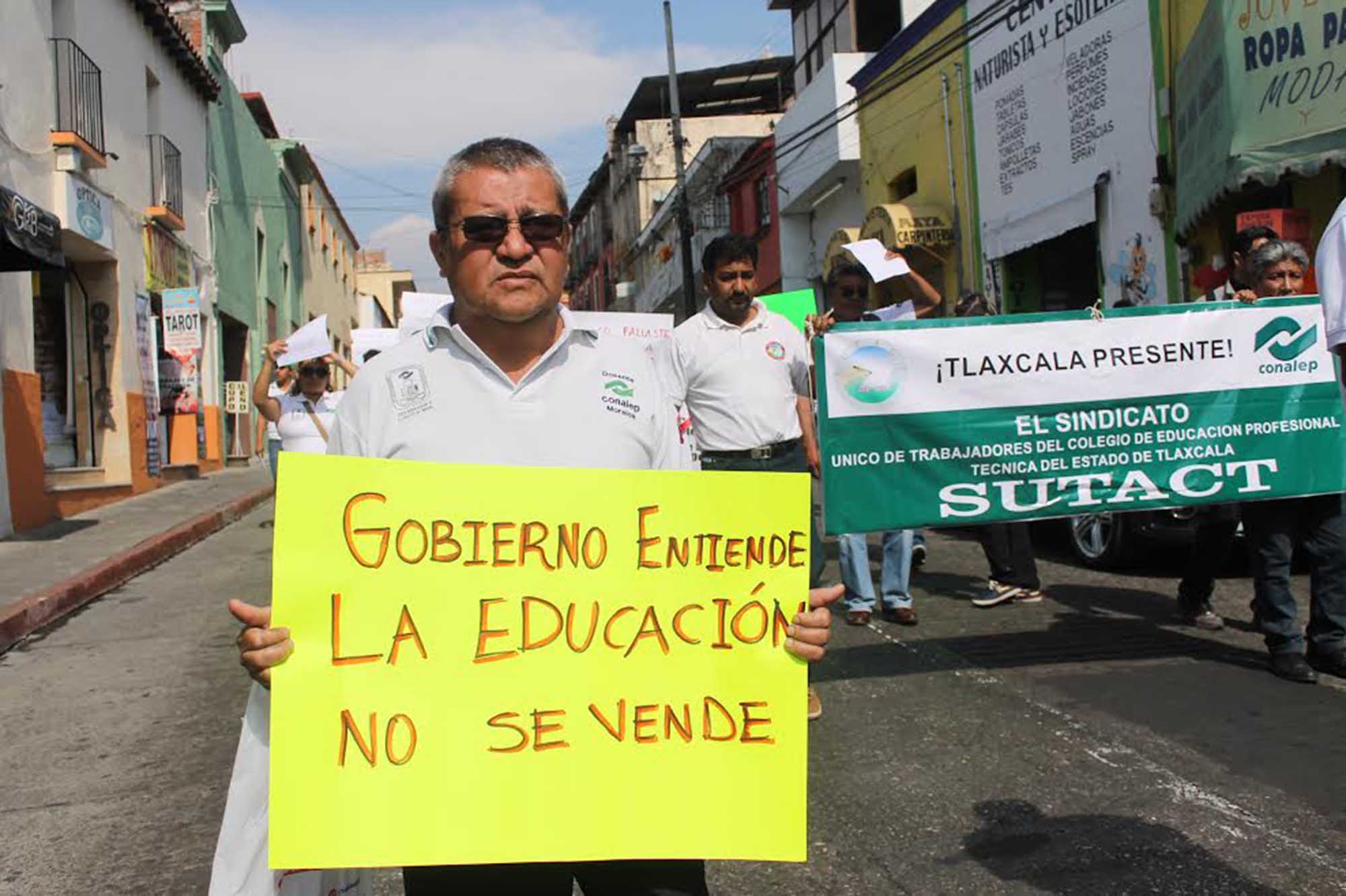 Alrededor de las 10:30 horas decenas de trabajadores académicos del conalep con sus pancartas que decían “Gobierno entiende, la educación no se vende”, marcharon del Calvario a Palacio de Gobierno, donde manifestaron que su protesta es un mensaje para que el Ejecutivo se ponga las pilas y resuelva el problema de los sistemas educativos del estado.
