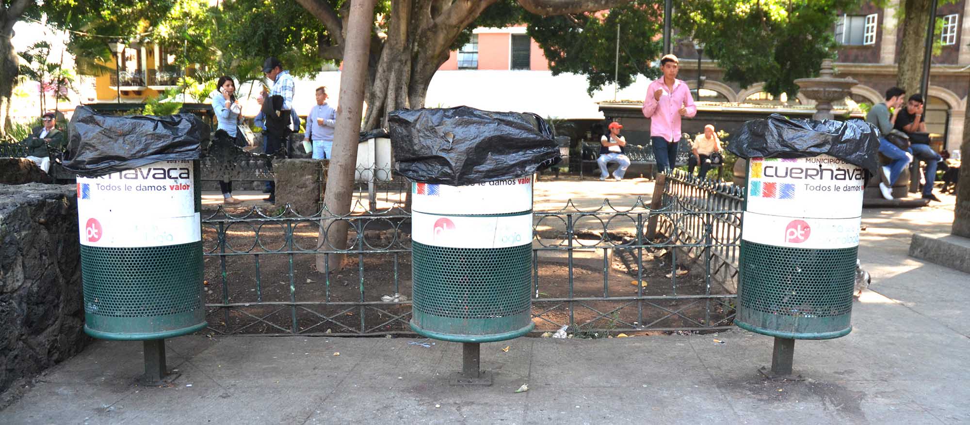 En la calle sólo hay botes con bolsas, botes con bolsas y a veces sólo la base de lo que fue un bote de basura, como en el caso del primer cuadro del centro de Cuernavaca. La gente, de todos modos, pone ahí su basura aunque no haya bote.