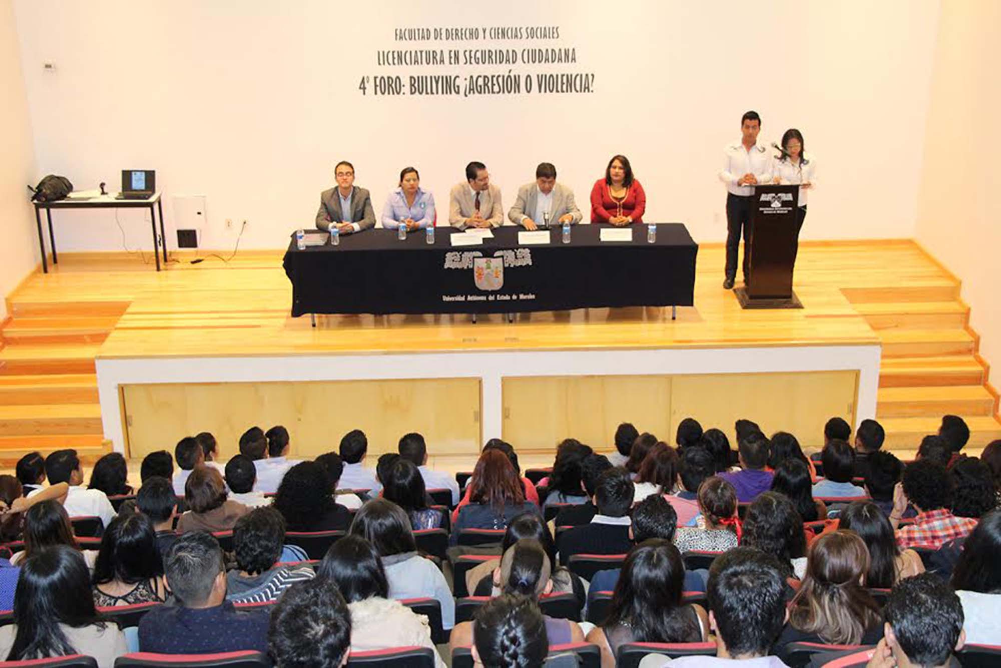 Cuernavaca, Morelos; 9 de febrero de 2015. Para identificar, prevenir, denunciar y atender casos de acoso escolar, esta mañana en la Biblioteca Central se llevó a cabo el 4 foro de Seguridad Ciudadana Bullying ¿agresión o violencia?, organizado por alumnos de la Licenciatura en Seguridad Ciudadana de la Facultad de Derecho y Ciencias de la Universidad Autónoma del Estado de Morelos (UAEM).