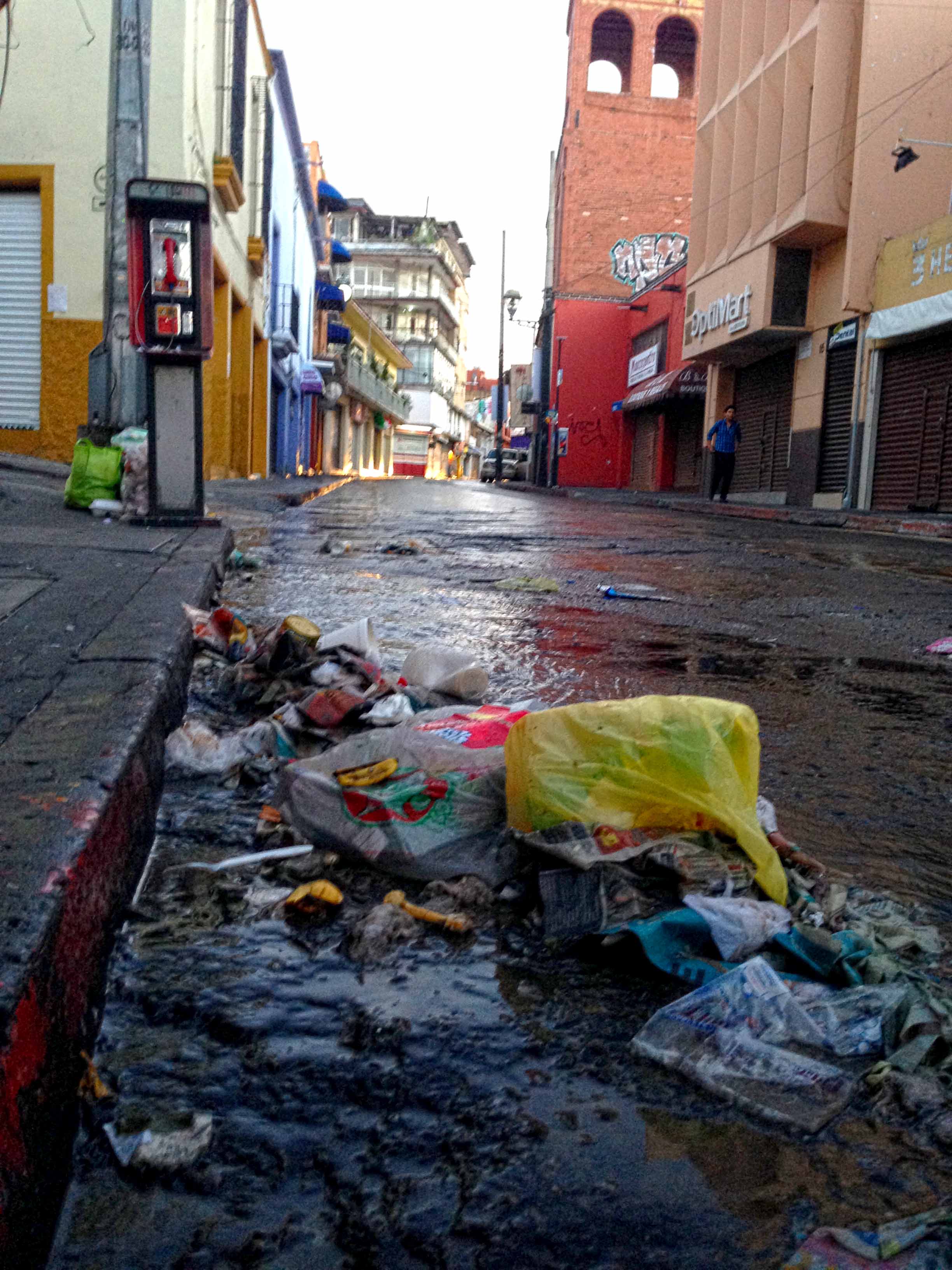 En la calle Aragón y León el agua regó algunas bolsas de basura arrinconadas sobre un poste de cemento.