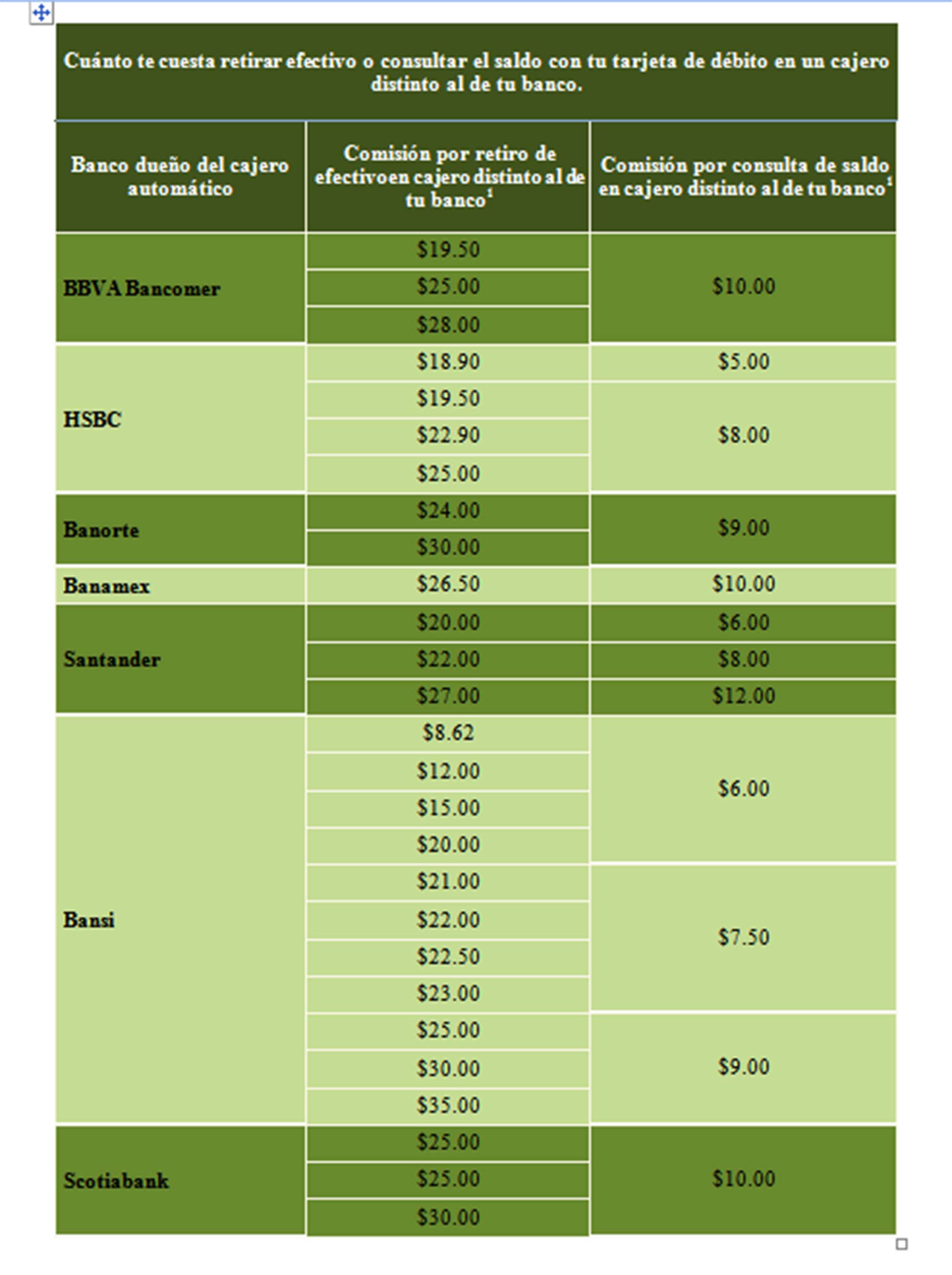 Comisiones que cobran las distintas instituciones financieras por el retiro de efectivo y consulta de saldo de los cajeros automáticos: