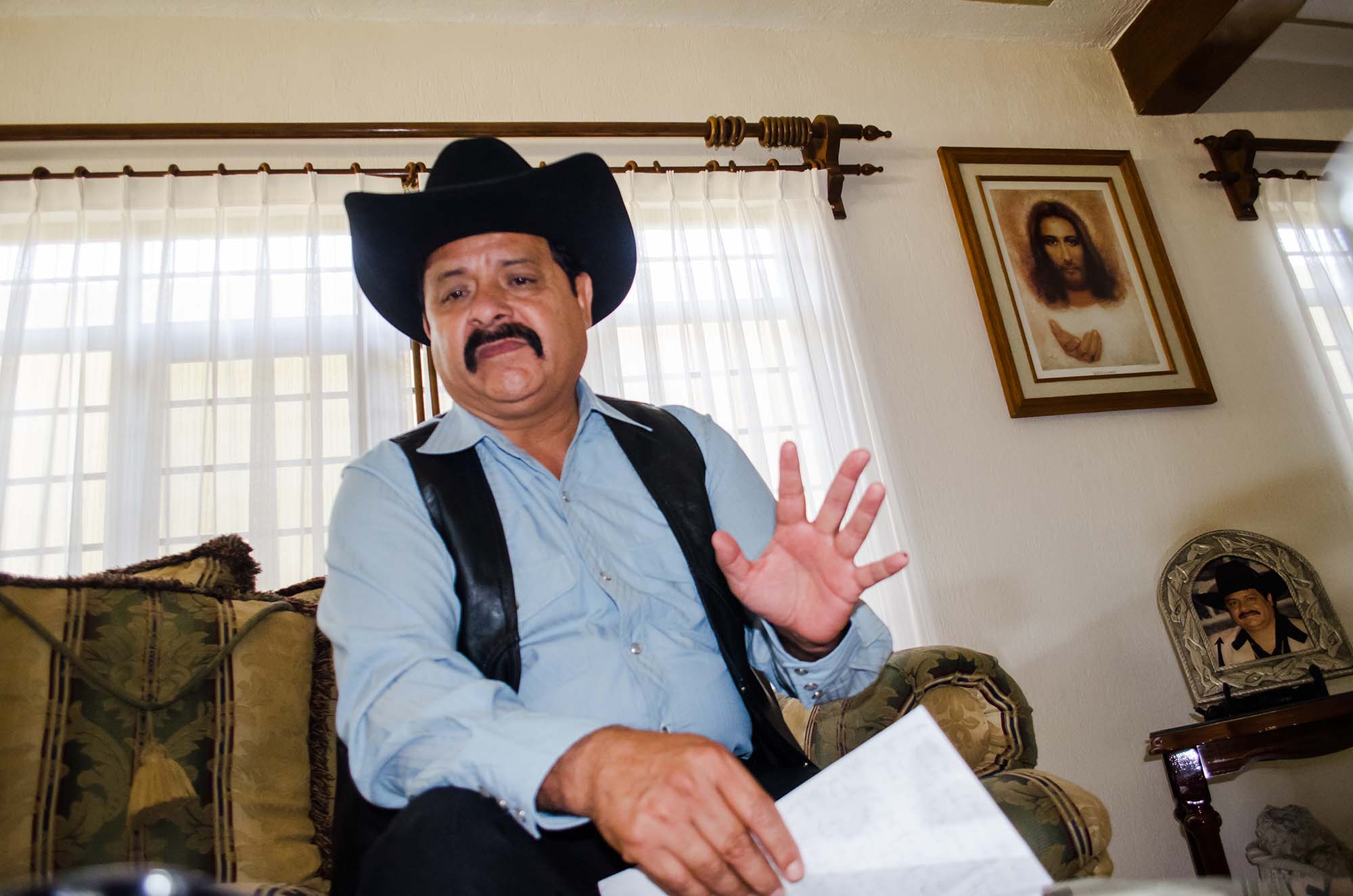 Sentado en un sillón, con botas, pantalón, tejana y chaleco negros, en el recibidor de su casa en Cuernavaca, el autor de “El Jefe de jefes”da su punto de vista sobre la reciente prohibición del espectáculo del cantante de narcocorridos Alfredo Ríos, el Komander, por el Ayuntamiento de Cuernavaca, programado para el 11 de abril de 2014.