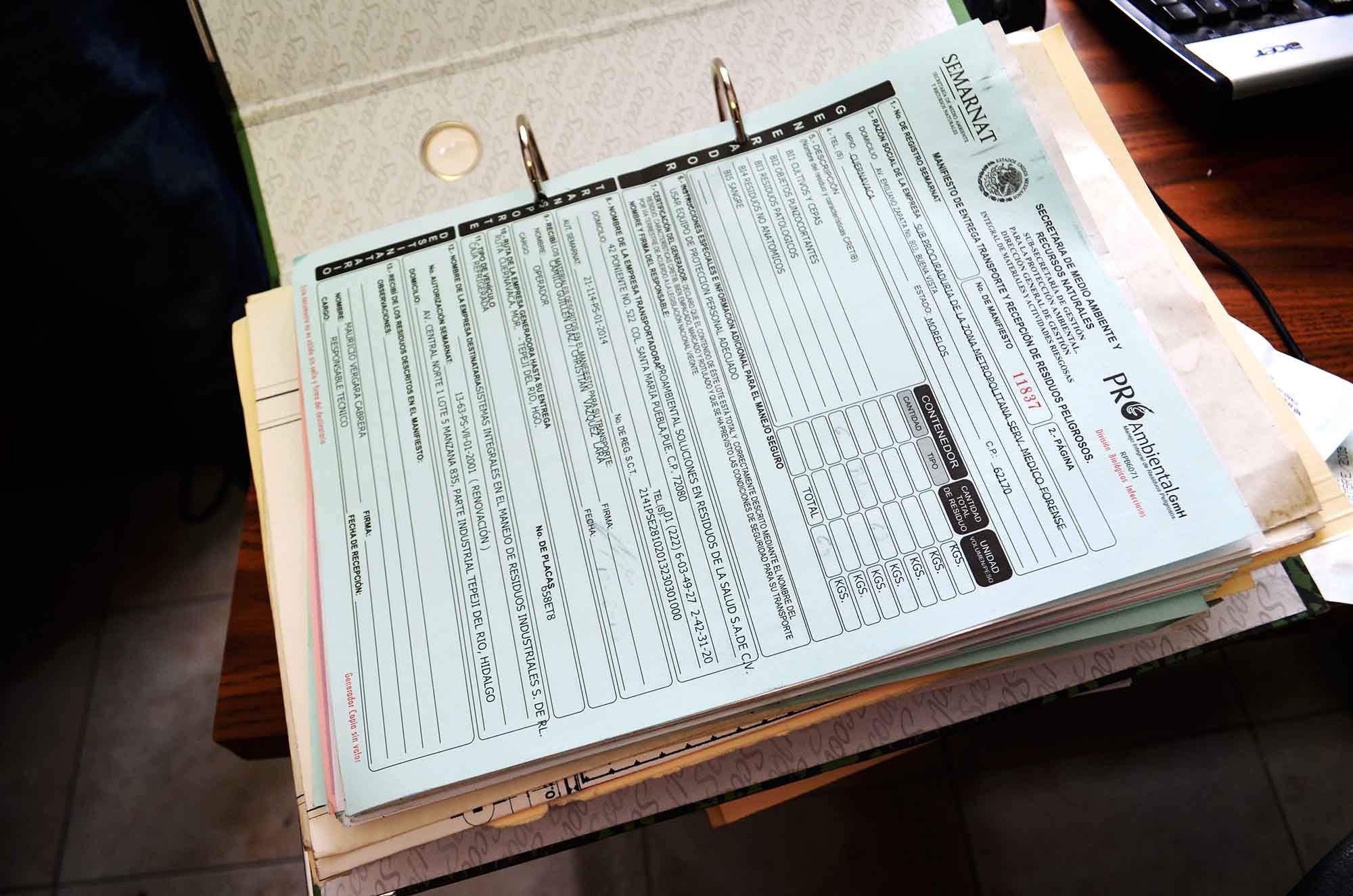 En ese lugar, Abel Dávila explica que en las tres plantas tratadoras de agua trabaja la compañía ProambientalgmH; fumiga, desazolva, da mantenimiento, hace la recolección de residuos peligrosos biológico infecciosos y del instrumental que usan los médicos legistas. “Hay otras dos empresas que hacen otras tareas, pero la principal es Proambiental. Cada dos meses se realiza un mantenimiento general de la planta, que incluyen desazolves; y cada semana pasan por los tejidos y residuos peligrosos biológicos infectocontagiosos y, de todos estos procedimientos, la Secretaría de Medio Ambiente y Recursos Naturales les extiende varios documentos, uno de ellos es el “manifiesto de entrega, transporte y recepción de Residuos peligrosos”, para cultivos y cepas, instrumental médico quirúrgico, residuos patológicos, residuos no anatómicos y sangre, entre otros.