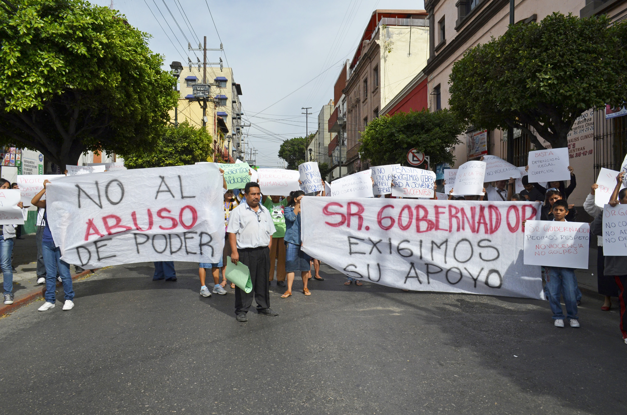 Los inconformes se apostaron en medio de la calle, con mantas y cartulinas pidiendo ayuda al gobierno acusando abuso de poder de los policías y el ejército en la detención de siete muchachos, entre ellos Luis Torres Valle.