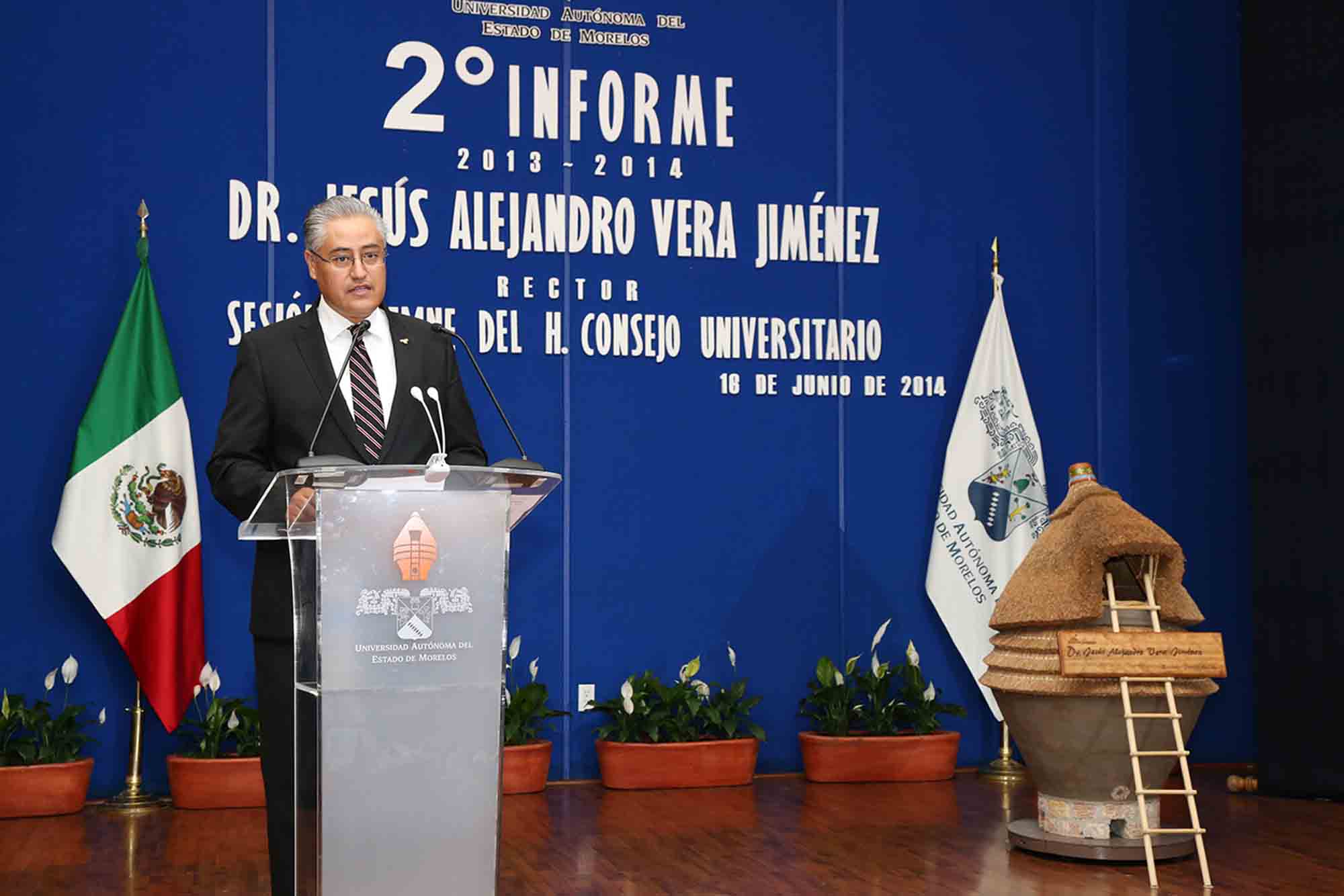 Cuernavaca, Morelos; 16 de junio de 2014. En cumplimiento a lo establecido en el Artículo 28 de la Ley Orgánica de la Universidad Autónoma del Estado de Morelos (UAEM), acerca de las obligaciones del Rector, este medio día, Alejandro Vera Jiménez presentó ante el Consejo Universitario en sesión solemne, su segundo informe de actividades al frente de la administración 2012-2018.