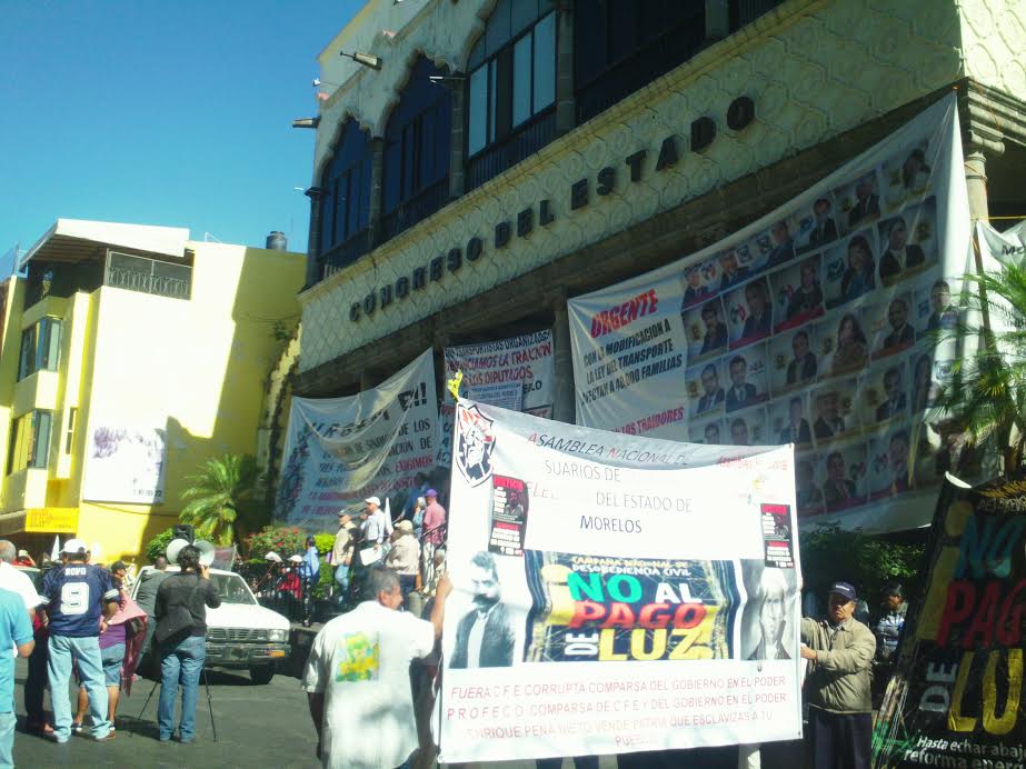 Cuernavaca, Morelos; 10 de enero de 2017. Por espacio de dos horas la circulación vehicular de la calle Matamoros fue modificada por un protesta que encabezaron integrantes de la Asamblea Nacional de Usuarios de la Energía Eléctrica (ANUEE), quienes se manifestaron a las afueras del Congreso del Estado de Morelos por el gasolinazo.