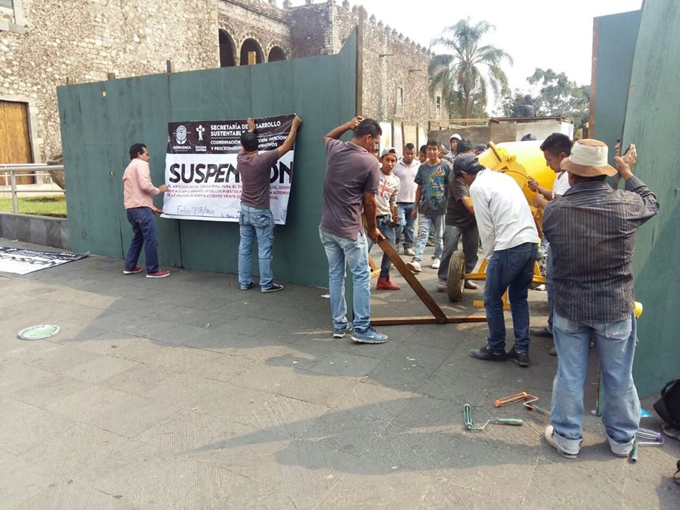 Cuernavaca, Morelos; 6 de marzo de 2017. Por diversas irregularidades y deficiencias en la licencia de construcción, el Ayuntamiento de Cuernavaca clausuró la obra de remodelación de la explanada del Palacio de Cortés.
